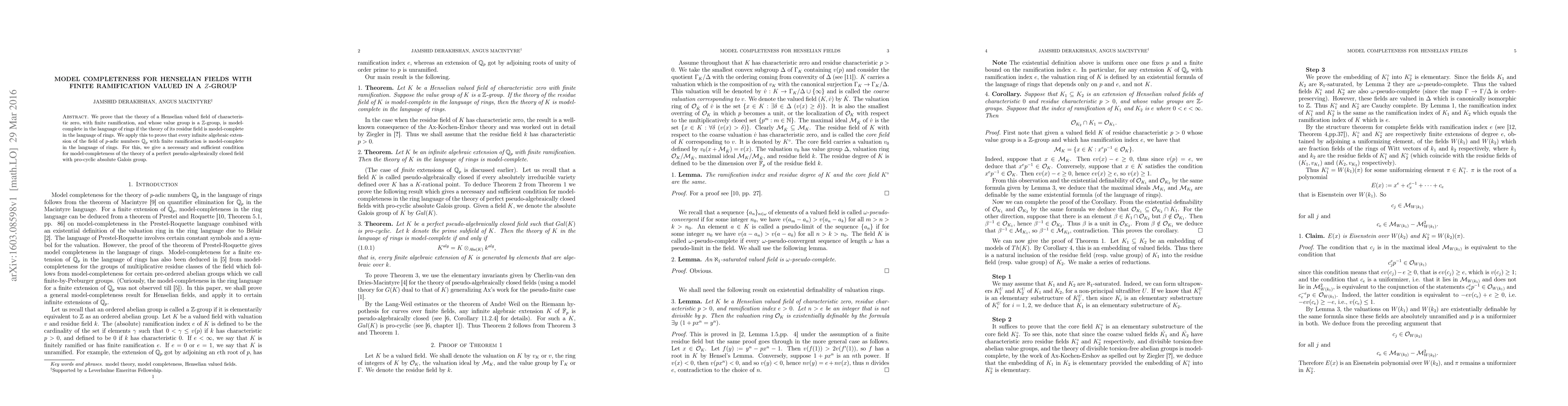 We prove that the theory of a Henselian valued field of characteristic zero, with finite ramification, and whose value group is a $Z$-group, is model-complete in the language of rings if the theory of its residue field is model-complete in the language of rings. We apply this to prove that every infinite algebraic extension of the field of $p$-adic numbers $\Bbb Q_p$ with finite ramification is model-complete in the language of rings. For this, we give a necessary and sufficient condition for model-completeness of the theory of a perfect pseudo-algebraically closed field with pro-cyclic absolute Galois group.