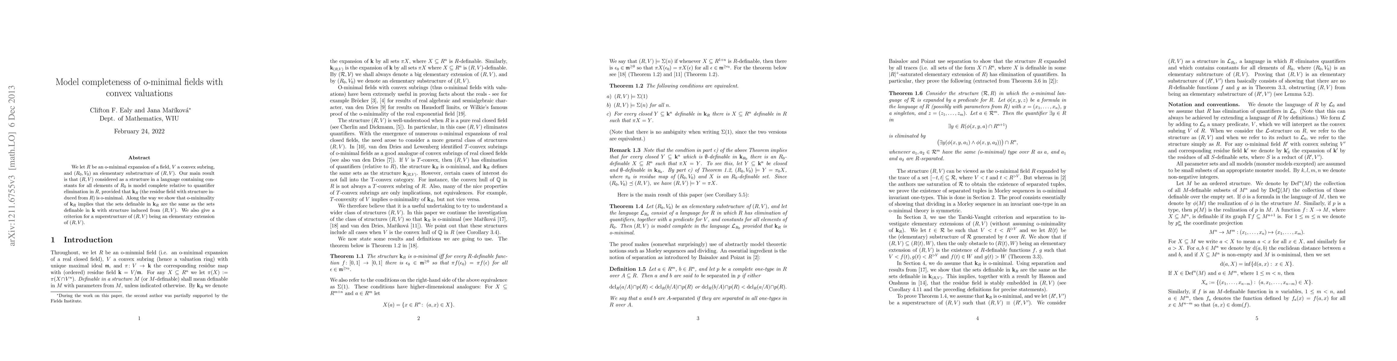 We let R be an o-minimal expansion of a field, V a convex subring, and $(R_0, V_{0})$ an elementary substructure of (R,V). We let L be the language consisting of a language for R, in which R has elimination of quantifiers, and a predicate for V, and we let $L_{R_{0}}$ be the language L expanded by constants for all elements of $R_0$. Our main result is that (R,V) considered as an $L_{R_{0}}$-structure is model complete provided that $k_R$, the corresponding residue field with structure induced from R, is o-minimal. Along the way we show that o-minimality of $k_R$ implies that the sets definable in $k_R$ are the same as the sets definable in k with structure induced from (R,V). We also give a criterion for a superstructure of (R,V) being an elementary extension of (R,V).