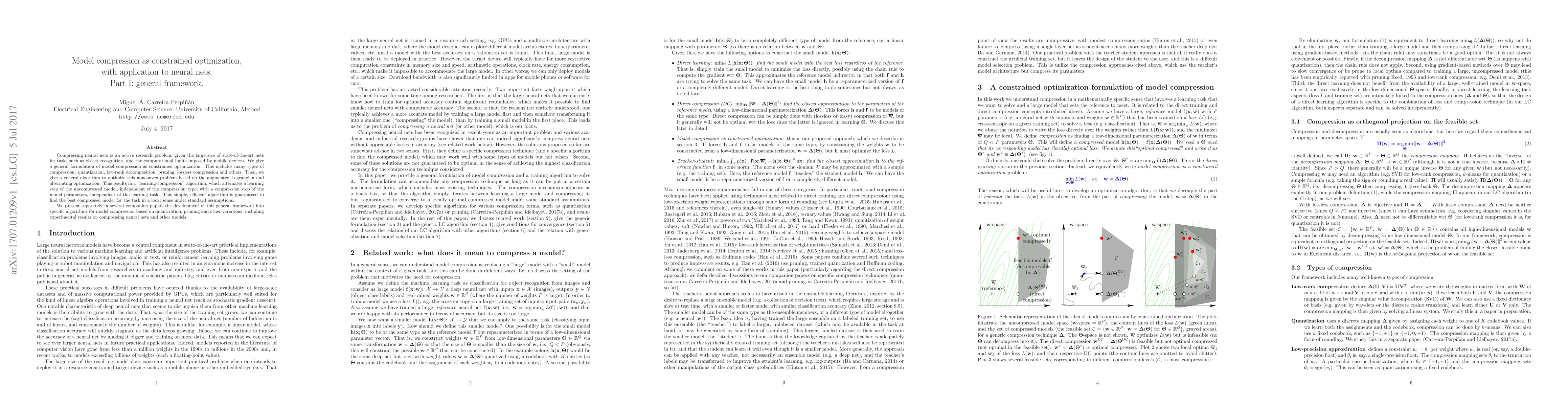 Compressing neural nets is an active research problem, given the large size of state-of-the-art nets for tasks such as object recognition, and the computational limits imposed by mobile devices. We give a general formulation of model compression as constrained optimization. This includes many types of compression: quantization, low-rank decomposition, pruning, lossless compression and others. Then, we give a general algorithm to optimize this nonconvex problem based on the augmented Lagrangian and alternating optimization. This results in a "learning-compression" algorithm, which alternates a learning step of the uncompressed model, independent of the compression type, with a compression step of the model parameters, independent of the learning task. This simple, efficient algorithm is guaranteed to find the best compressed model for the task in a local sense under standard assumptions. We present separately in several companion papers the development of this general framework into specific algorithms for model compression based on quantization, pruning and other variations, including experimental results on compressing neural nets and other models.