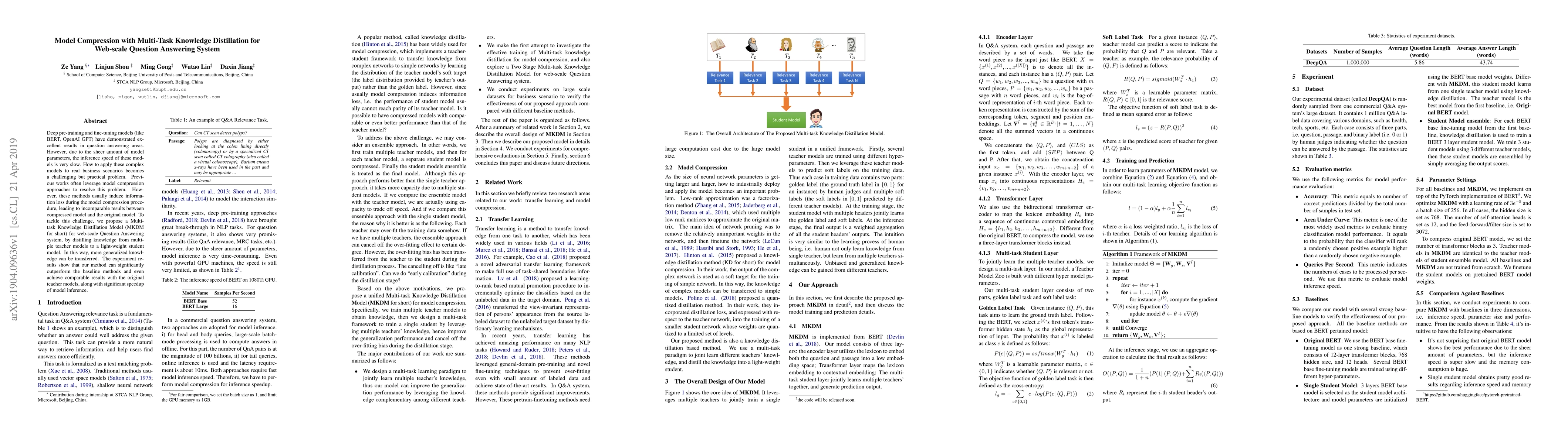 This paper proposes a Multi-task Knowledge Distillation Model (MKDM) to compress large language models for web-scale question answering, achieving comparable performance to the original models while significantly speeding up inference. The method distills knowledge from multiple teacher models to a lightweight student model, minimizing information loss.
