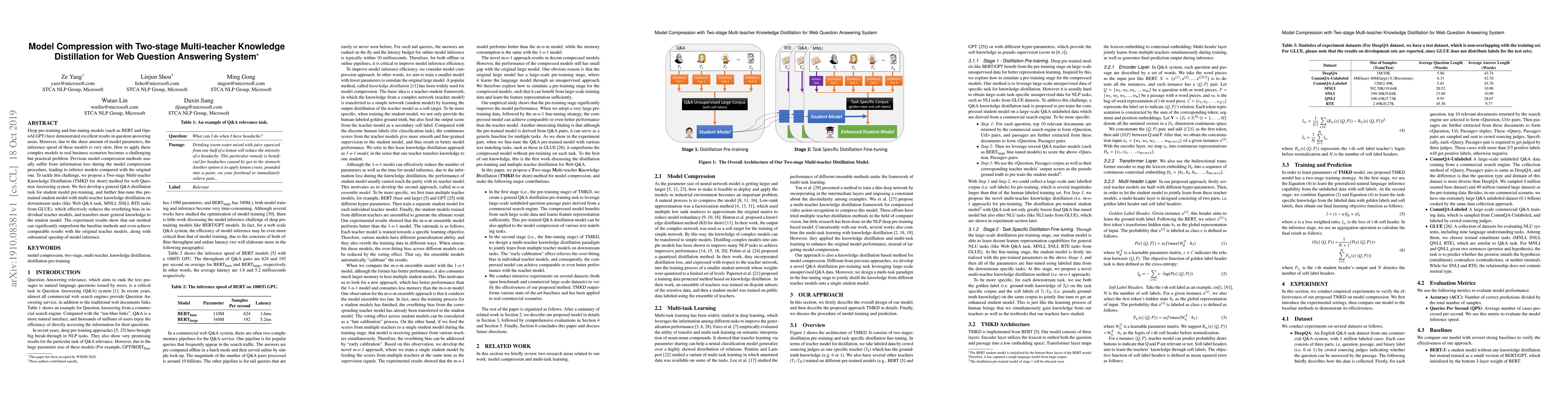 Deep pre-training and fine-tuning models (such as BERT and OpenAI GPT) have demonstrated excellent results in question answering areas. However, due to the sheer amount of model parameters, the inference speed of these models is very slow. How to apply these complex models to real business scenarios becomes a challenging but practical problem. Previous model compression methods usually suffer from information loss during the model compression procedure, leading to inferior models compared with the original one. To tackle this challenge, we propose a Two-stage Multi-teacher Knowledge Distillation (TMKD for short) method for web Question Answering system. We first develop a general Q\&A distillation task for student model pre-training, and further fine-tune this pre-trained student model with multi-teacher knowledge distillation on downstream tasks (like Web Q\&A task, MNLI, SNLI, RTE tasks from GLUE), which effectively reduces the overfitting bias in individual teacher models, and transfers more general knowledge to the student model. The experiment results show that our method can significantly outperform the baseline methods and even achieve comparable results with the original teacher models, along with substantial speedup of model inference.