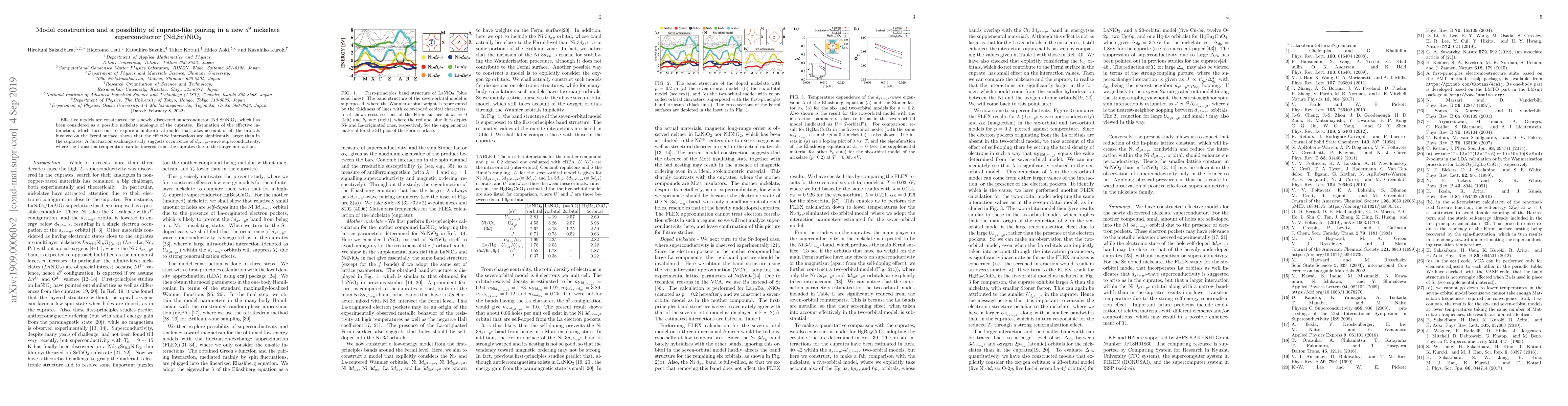 Effective models are constructed for a newly discovered superconductor (Nd,Sr)NiO2, which has been considered as a possible nickelate analogue of the cuprates owing to the d9 electron configuration. Estimation of the effective interaction, which turns out to require a multiorbital model that takes account of all the orbitals involved on the Fermi surface, shows that the effective interactions are significantly larger than in the cuprates. A fluctuation exchange study for the model indicates that dx2-y2-wave superconductivity is likely to occur as in the cuprates, where the transition temperature in the nickelate can be lower from the cuprates due to the larger interaction and narrower bandwidth.