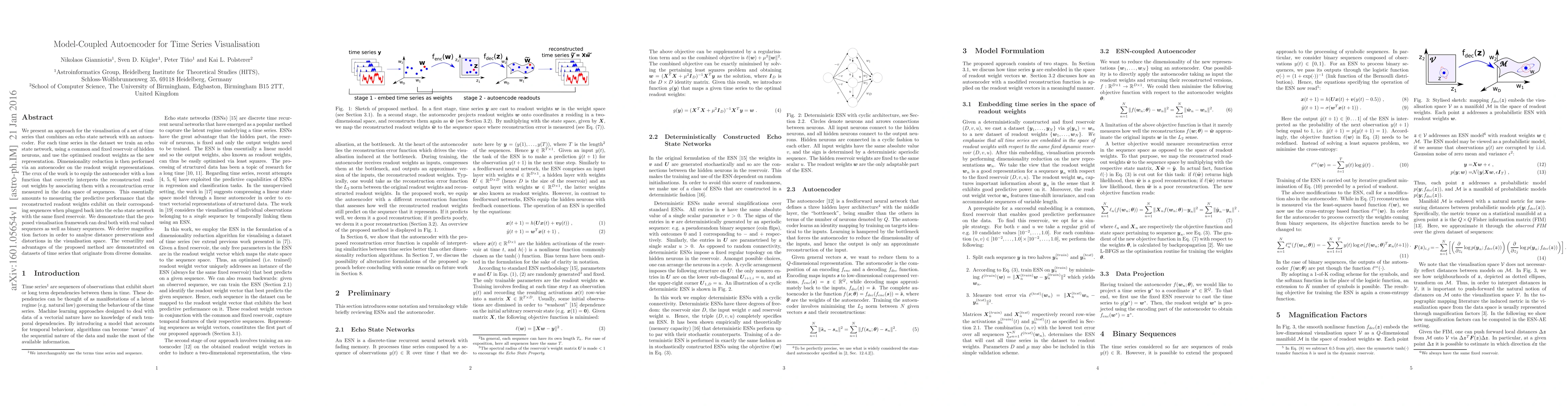 This paper proposes a model-coupled autoencoder approach combining an echo state network and an autoencoder for time series visualisation, using optimised readout weights for dimensionality reduction and a loss function that measures predictive performance. The method is shown to effectively handle diverse time series datasets, with analysis of distance preservations and distortions.