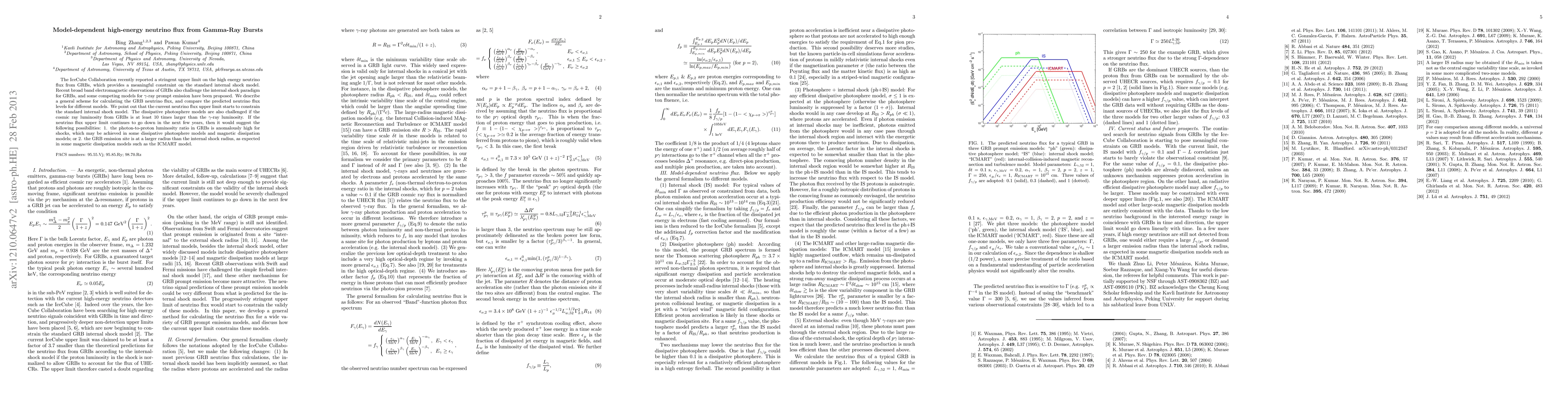 This paper discusses the stringent upper limit on high-energy neutrino flux from Gamma-Ray Bursts (GRBs) reported by the IceCube Collaboration, which constrains the standard internal shock model. It proposes a general scheme for calculating neutrino flux from GRBs, comparing predictions across different models and suggesting that the limit may indicate either high photon-to-proton ratios or emission sites at larger radii than internal shock radii.