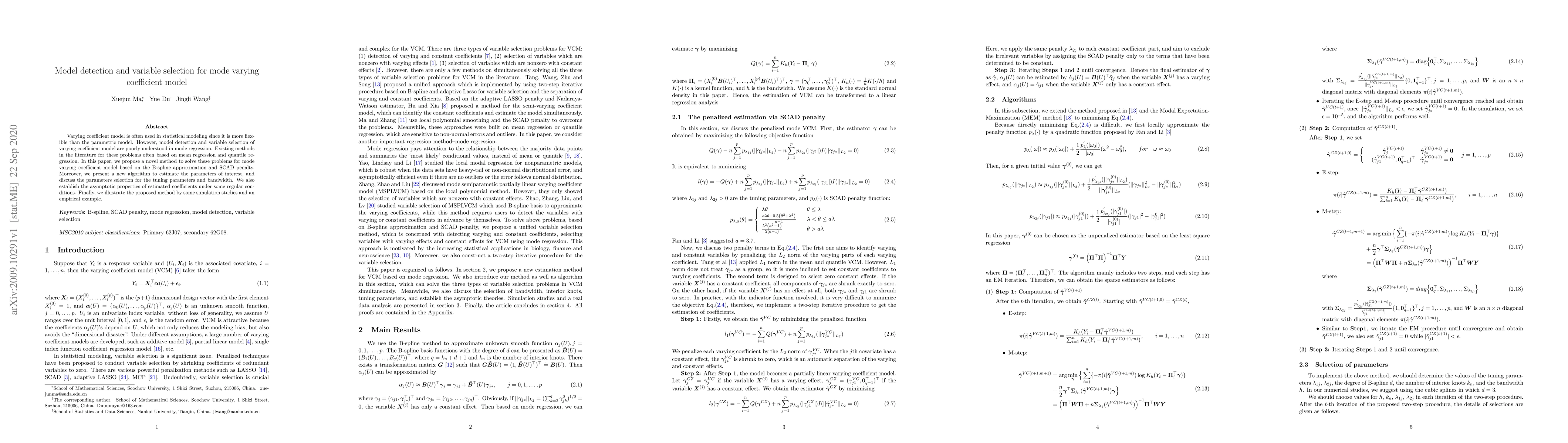 This paper proposes a novel method for model detection and variable selection in mode varying coefficient models using B-spline approximation and SCAD penalty. It introduces a new algorithm for parameter estimation and discusses tuning parameter selection and bandwidth, establishing asymptotic properties and validating the method through simulations and an empirical example.