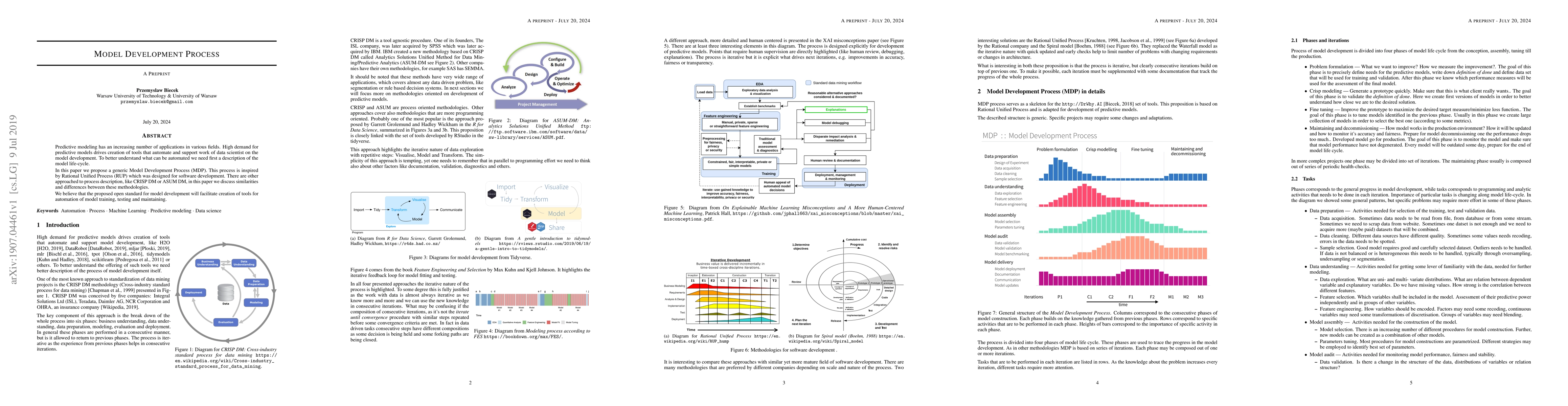 Predictive modeling has an increasing number of applications in various fields. High demand for predictive models drives creation of tools that automate and support work of data scientist on the model development. To better understand what can be automated we need first a description of the model life-cycle. In this paper we propose a generic Model Development Process (MDP). This process is inspired by Rational Unified Process (RUP) which was designed for software development. There are other approached to process description, like CRISP DM or ASUM DM, in this paper we discuss similarities and differences between these methodologies. We believe that the proposed open standard for model development will facilitate creation of tools for automation of model training, testing and maintaining.