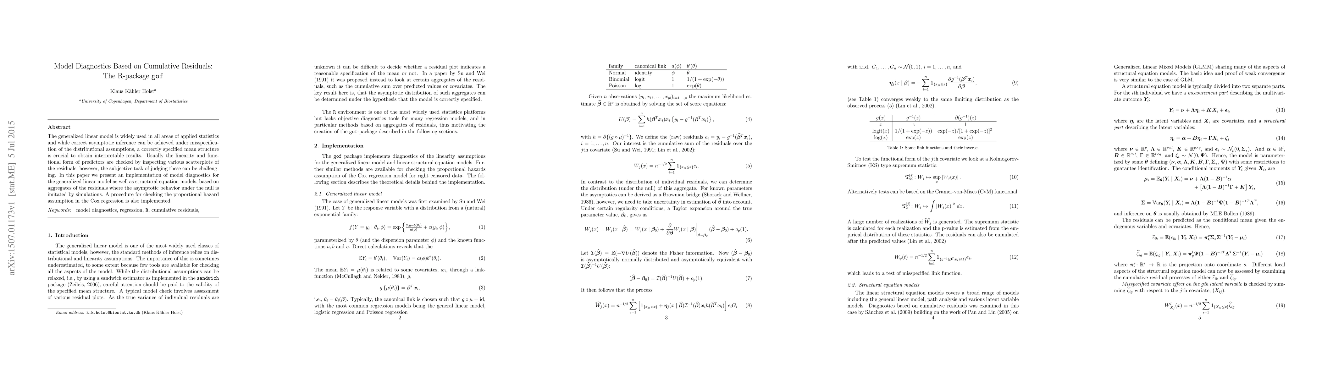 This paper introduces the R-package gof for model diagnostics in generalized linear models and structural equation models, utilizing cumulative residuals to provide objective checks on model assumptions and the proportional hazard assumption in Cox regression. The approach uses simulations to mimic asymptotic behavior under the null hypothesis.