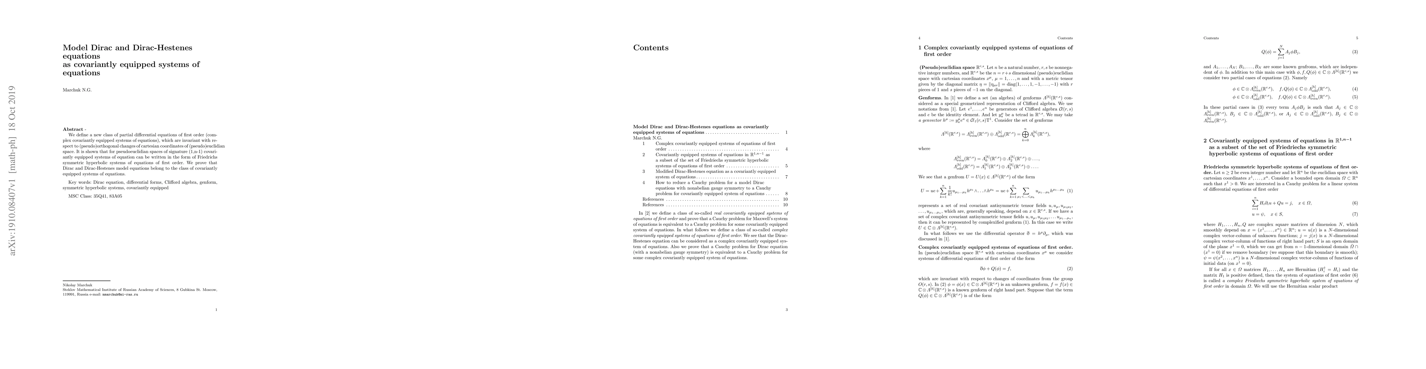 We define a new class of partial differential equations of first order (complex covariantly equipped systems of equations), which are invariant with respect to (pseudo)orthogonal changes of cartesian coordinates of (pseudo)euclidian space. It is shown that for pseudoeuclidian spaces of signature (1,n-1) covariantly equipped systems of equation can be written in the form of Friedrichs symmetric hyperbolic systems of equations of first order. We prove that Dirac and Dirac-Hestenes model equations belong to the class of covariantly equipped systems of equations.