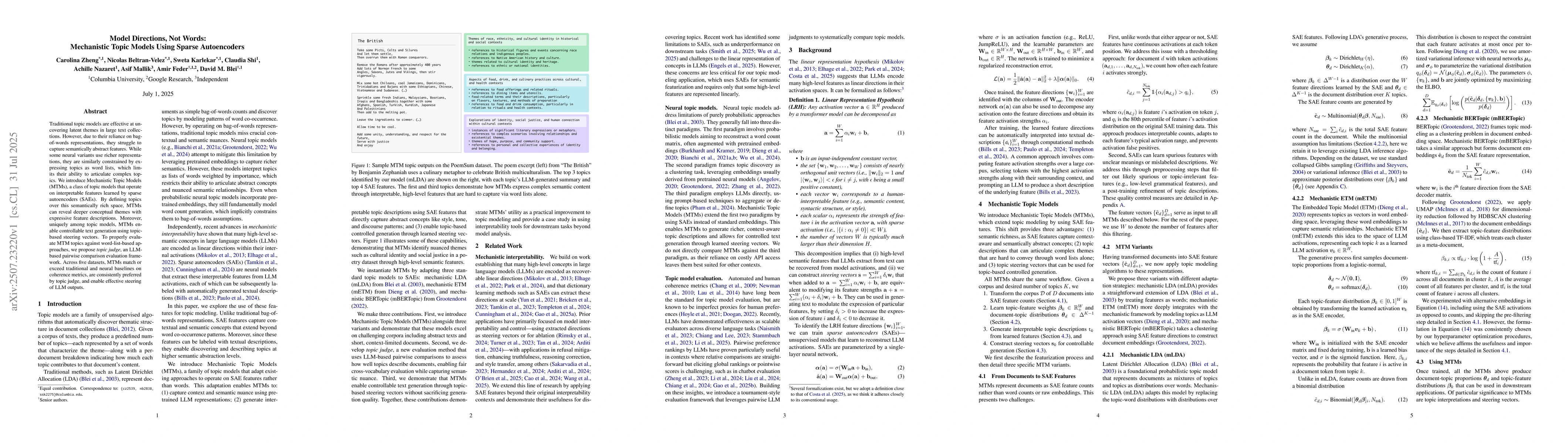 The paper introduces Mechanistic Topic Models (MTMs) that utilize sparse autoencoders to learn interpretable features, enabling the capture of complex, semantically rich topics. MTMs outperform traditional and neural topic models in coherence and are preferred in LLM-based evaluations, also allowing for controllable text generation.