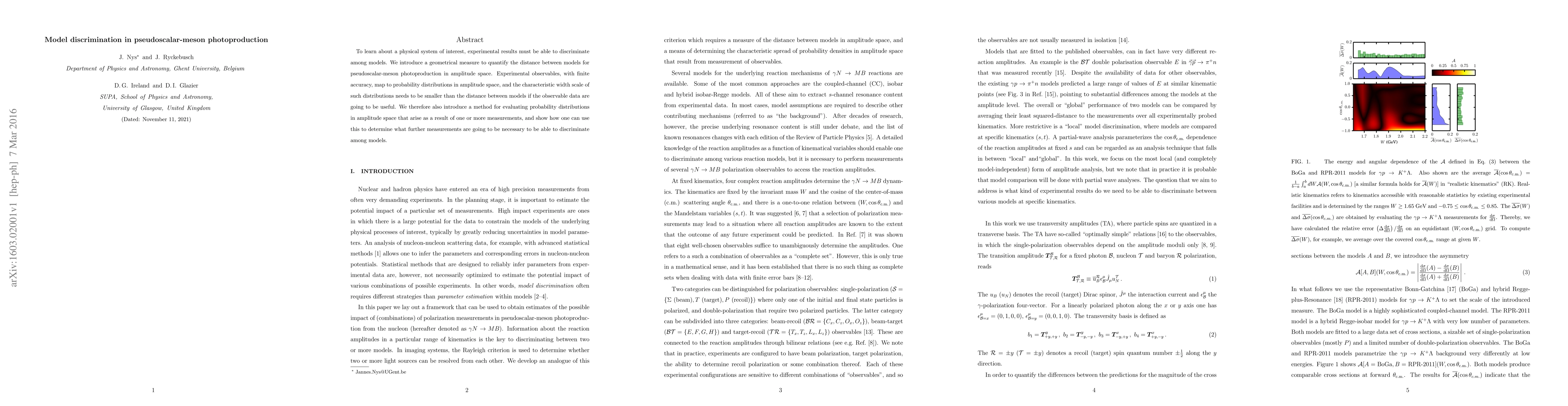 To learn about a physical system of interest, experimental results must be able to discriminate among models. We introduce a geometrical measure to quantify the distance between models for pseudoscalar-meson photoproduction in amplitude space. Experimental observables, with finite accuracy, map to probability distributions in amplitude space, and the characteristic width scale of such distributions needs to be smaller than the distance between models if the observable data are going to be useful. We therefore also introduce a method for evaluating probability distributions in amplitude space that arise as a result of one or more measurements, and show how one can use this to determine what further measurements are going to be necessary to be able to discriminate among models.