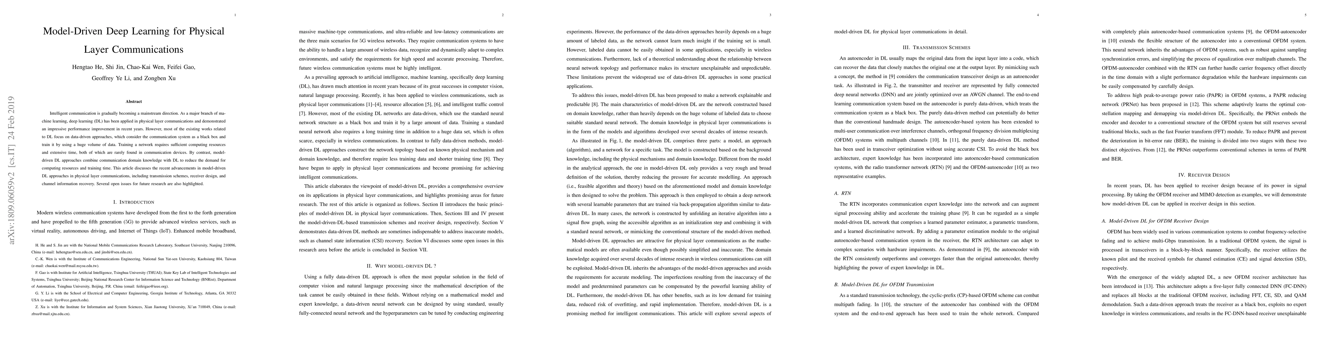 This paper reviews advancements in model-driven deep learning applications for physical layer communications, emphasizing reduced computational demands and training time compared to data-driven methods. It surveys recent developments in transmission schemes, receiver design, and channel information recovery, and identifies open research issues.