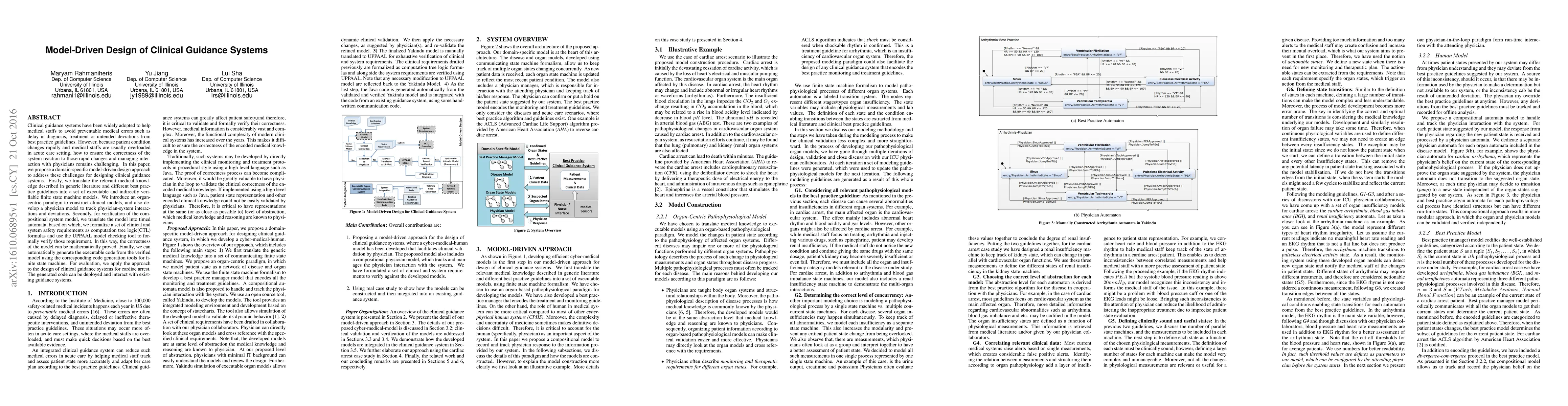 This paper proposes a model-driven design approach for clinical guidance systems, translating medical knowledge into executable finite state machine models to ensure system correctness amidst rapid patient condition changes. The approach uses timed automata and formal verification to mathematically prove the model's correctness, and generates executable code for deployment in cardiac arrest guidance systems.