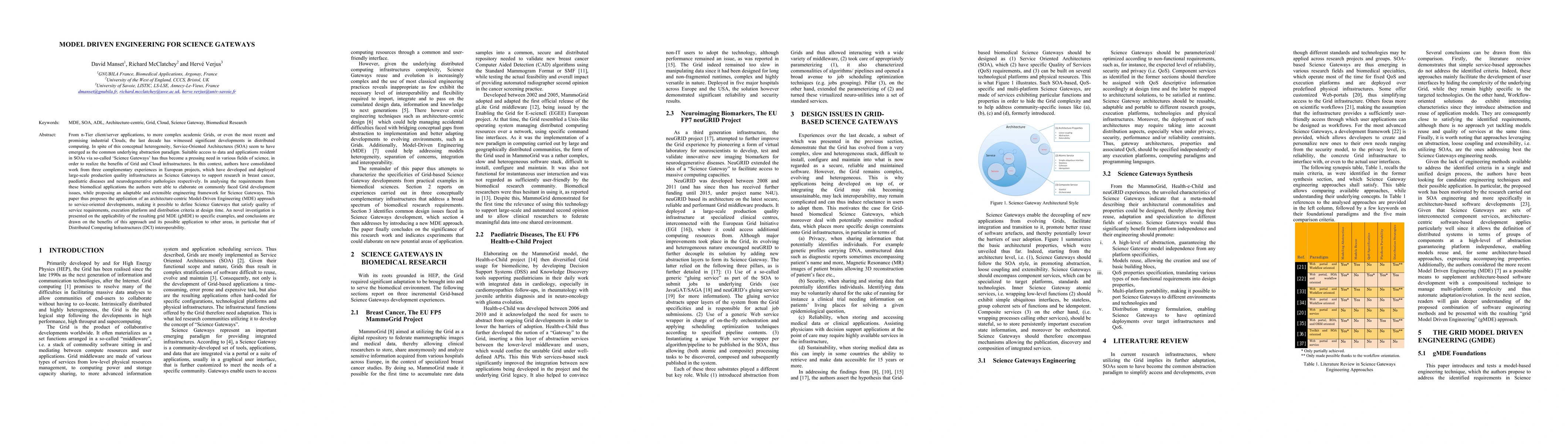 This paper proposes a Model-Driven Engineering (MDE) framework for developing Science Gateways to facilitate access to distributed computing resources in Grid and Cloud infrastructures. The authors demonstrate the framework's applicability through examples from biomedical research projects, highlighting its benefits in meeting quality of service and interoperability requirements.