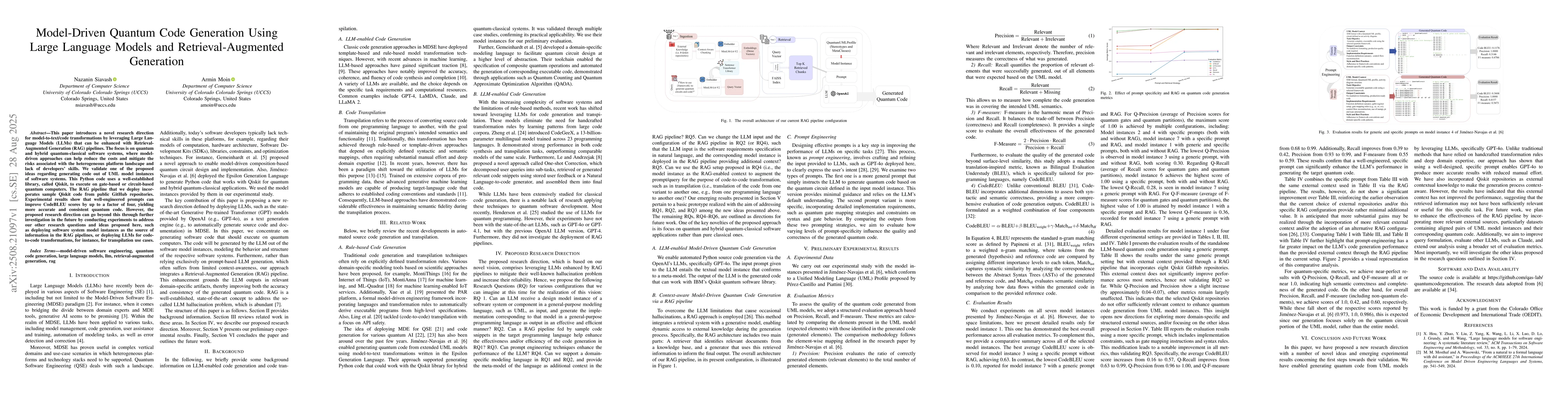 This paper introduces a novel research direction for model-to-text/code transformations by leveraging Large Language Models (LLMs) that can be enhanced with Retrieval-Augmented Generation (RAG) pipelines. The focus is on quantum and hybrid quantum-classical software systems, where model-driven approaches can help reduce the costs and mitigate the risks associated with the heterogeneous platform landscape and lack of developers' skills. We validate one of the proposed ideas regarding generating code out of UML model instances of software systems. This Python code uses a well-established library, called Qiskit, to execute on gate-based or circuit-based quantum computers. The RAG pipeline that we deploy incorporates sample Qiskit code from public GitHub repositories. Experimental results show that well-engineered prompts can improve CodeBLEU scores by up to a factor of four, yielding more accurate and consistent quantum code. However, the proposed research direction can go beyond this through further investigation in the future by conducting experiments to address our other research questions and ideas proposed here, such as deploying software system model instances as the source of information in the RAG pipelines, or deploying LLMs for code-to-code transformations, for instance, for transpilation use cases.