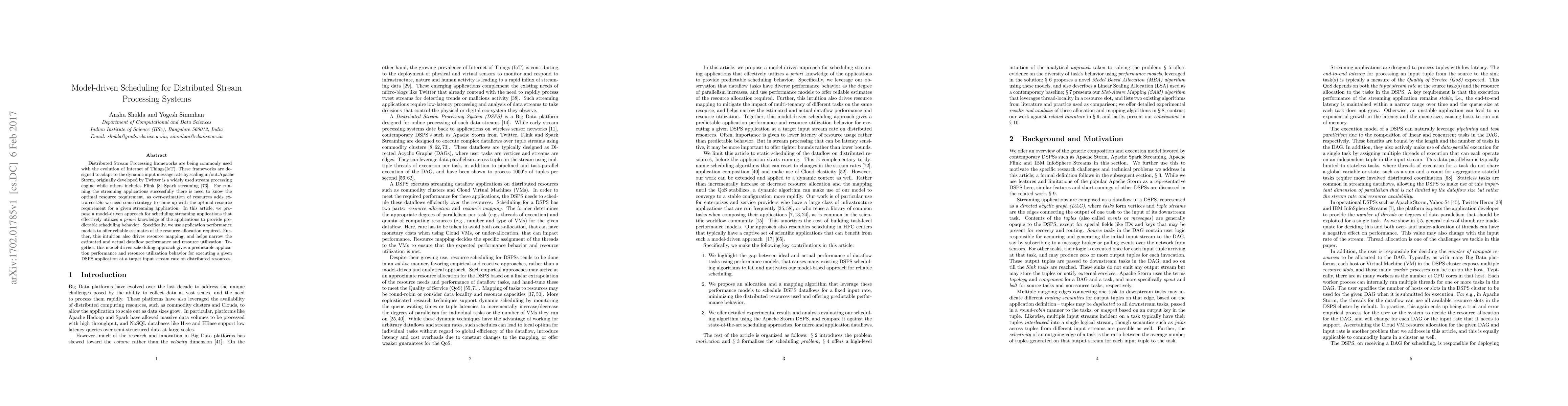 Distributed Stream Processing frameworks are being commonly used with the evolution of Internet of Things(IoT). These frameworks are designed to adapt to the dynamic input message rate by scaling in/out.Apache Storm, originally developed by Twitter is a widely used stream processing engine while others includes Flink, Spark streaming. For running the streaming applications successfully there is need to know the optimal resource requirement, as over-estimation of resources adds extra cost.So we need some strategy to come up with the optimal resource requirement for a given streaming application. In this article, we propose a model-driven approach for scheduling streaming applications that effectively utilizes a priori knowledge of the applications to provide predictable scheduling behavior. Specifically, we use application performance models to offer reliable estimates of the resource allocation required. Further, this intuition also drives resource mapping, and helps narrow the estimated and actual dataflow performance and resource utilization. Together, this model-driven scheduling approach gives a predictable application performance and resource utilization behavior for executing a given DSPS application at a target input stream rate on distributed resources.