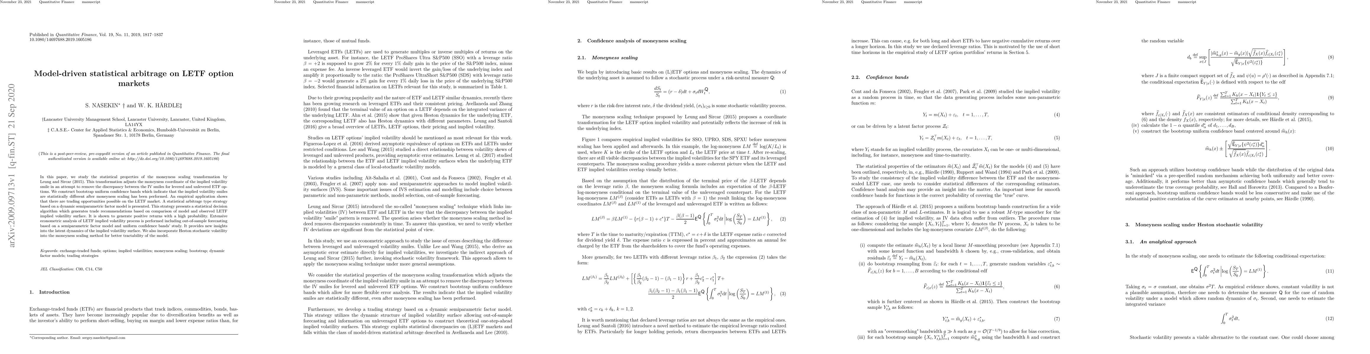 In this paper, we study the statistical properties of the moneyness scaling transformation by Leung and Sircar (2015). This transformation adjusts the moneyness coordinate of the implied volatility smile in an attempt to remove the discrepancy between the IV smiles for levered and unlevered ETF options. We construct bootstrap uniform confidence bands which indicate that the implied volatility smiles are statistically different after moneyness scaling has been performed. An empirical application shows that there are trading opportunities possible on the LETF market. A statistical arbitrage type strategy based on a dynamic semiparametric factor model is presented. This strategy presents a statistical decision algorithm which generates trade recommendations based on comparison of model and observed LETF implied volatility surface. It is shown to generate positive returns with a high probability. Extensive econometric analysis of LETF implied volatility process is performed including out-of-sample forecasting based on a semiparametric factor model and uniform confidence bands' study. It provides new insights into the latent dynamics of the implied volatility surface. We also incorporate Heston stochastic volatility into the moneyness scaling method for better tractability of the model.