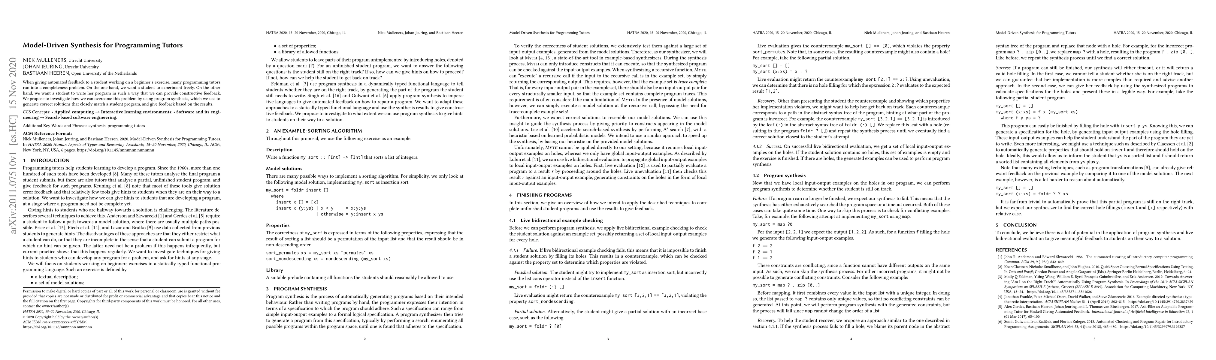 Researchers propose using program synthesis to help programming tutors provide constructive feedback while allowing students to experiment freely. This approach generates correct solutions that closely match student programs, enabling targeted and effective feedback.