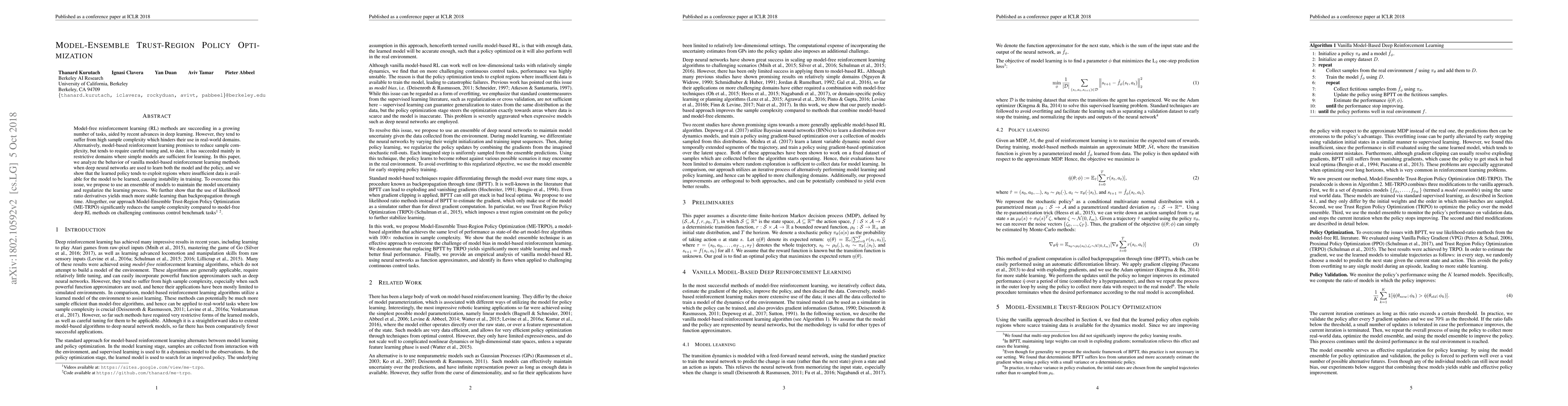This paper introduces Model-Ensemble Trust-Region Policy Optimization, a method that reduces sample complexity in model-based reinforcement learning using an ensemble of models and likelihood ratio derivatives.
