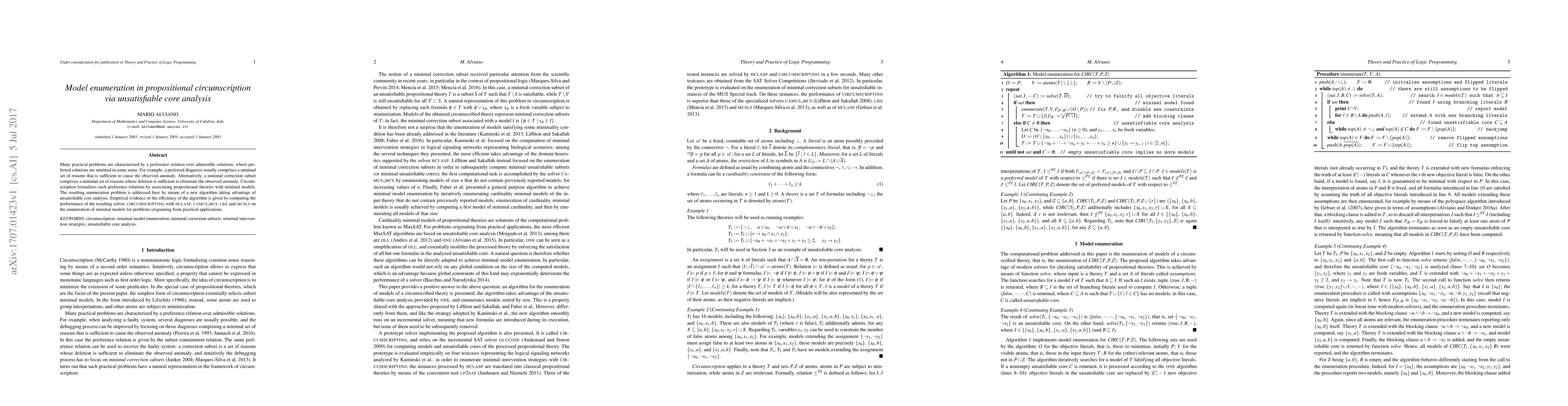 This paper proposes a new algorithm for enumerating minimal models in propositional circumscription using unsatisfiable core analysis, and presents empirical evidence comparing its performance with existing solvers on practical problem instances. The algorithm aims to efficiently identify minimal solutions in preference relations.