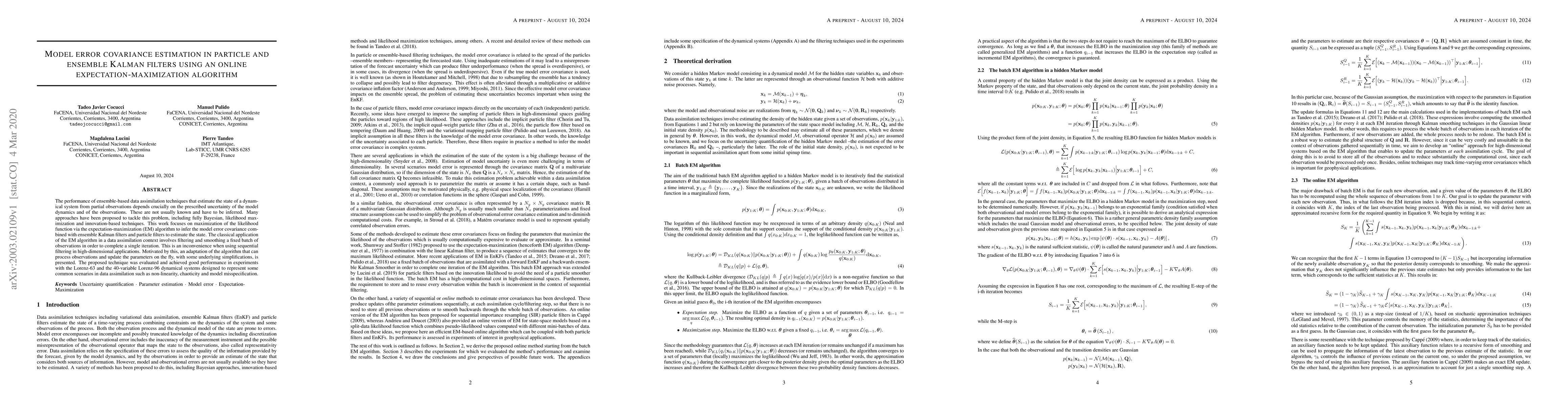 This paper proposes an online adaptation of the expectation-maximization algorithm to estimate model error covariance in ensemble and particle filters for data assimilation, enabling real-time parameter updates during sequential filtering. The method was successfully tested on Lorenz-63 and Lorenz-96 systems, demonstrating its effectiveness in high-dimensional, nonlinear scenarios.