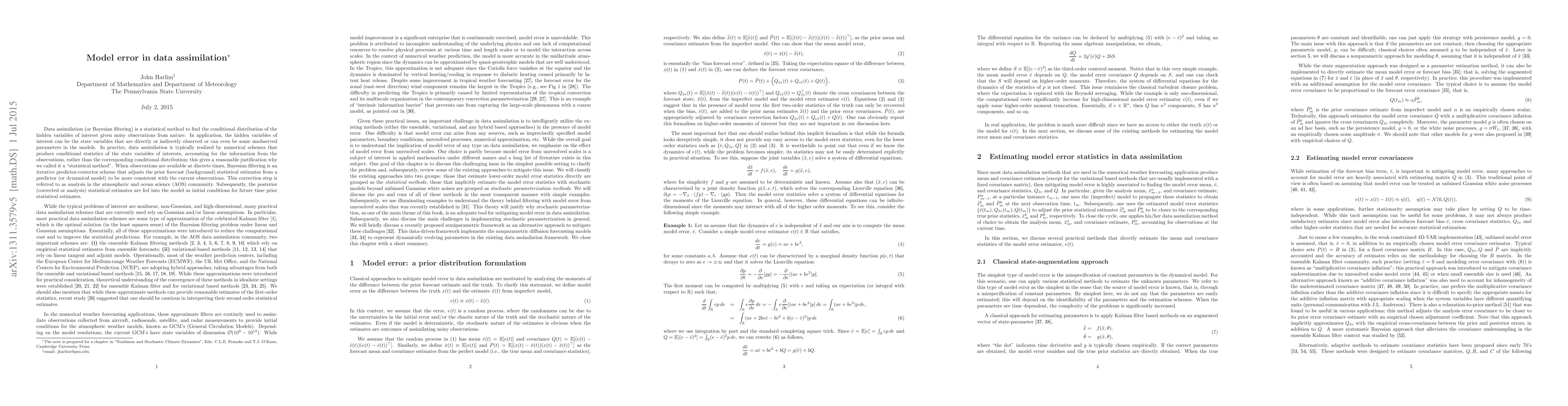 This paper explores the challenges of model error in data assimilation, particularly focusing on unresolved scales and their implications. It classifies existing methods into statistical and stochastic parameterizations, advocating for the latter's efficacy in mitigating model error, while also discussing its general application challenges and proposing a nonparametric alternative.
