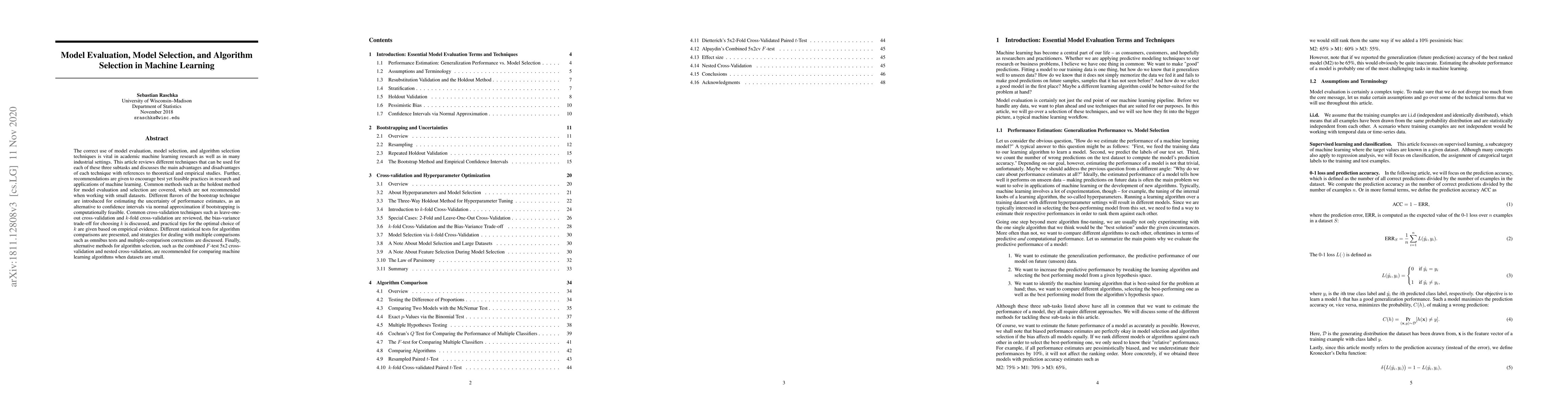 This paper reviews techniques for model evaluation, model selection, and algorithm selection in machine learning, highlighting the pros and cons of common methods like holdout and cross-validation. It recommends best practices, especially for small datasets, and introduces advanced methods like bootstrapping and nested cross-validation for more accurate performance estimation.