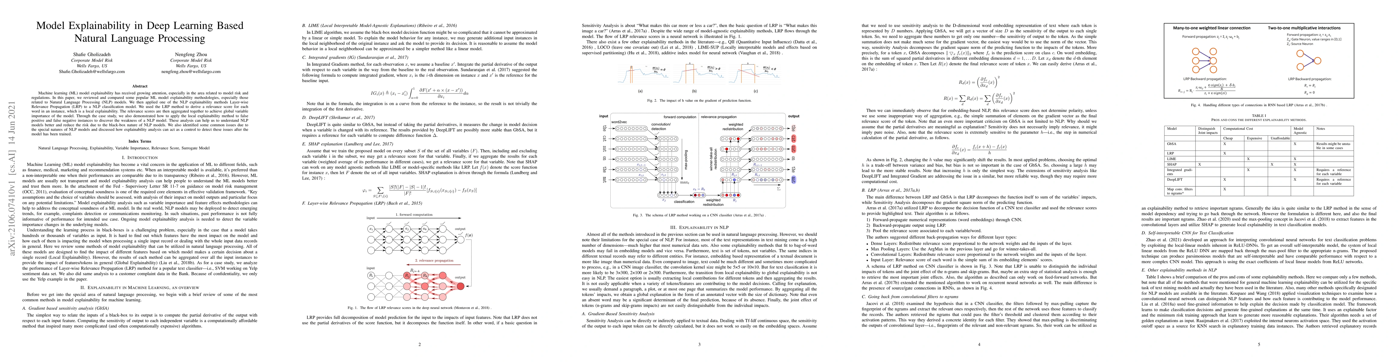 This paper reviews and compares various model explainability methodologies, particularly focusing on NLP models. It applies Layer-wise Relevance Propagation (LRP) to a NLP classification model to derive local relevance scores for each word, which helps in achieving global variable importance and identifying model weaknesses in false positives and negatives, thus aiding in understanding and mitigating the risks of black-box NLP models.