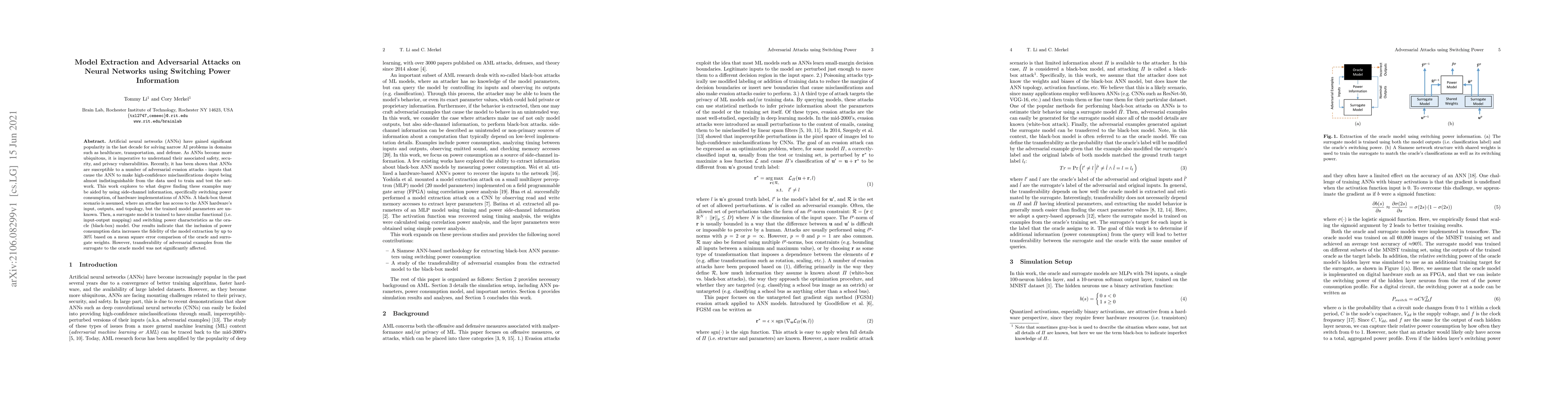 Artificial neural networks (ANNs) have gained significant popularity in the last decade for solving narrow AI problems in domains such as healthcare, transportation, and defense. As ANNs become more ubiquitous, it is imperative to understand their associated safety, security, and privacy vulnerabilities. Recently, it has been shown that ANNs are susceptible to a number of adversarial evasion attacks--inputs that cause the ANN to make high-confidence misclassifications despite being almost indistinguishable from the data used to train and test the network. This work explores to what degree finding these examples maybe aided by using side-channel information, specifically switching power consumption, of hardware implementations of ANNs. A black-box threat scenario is assumed, where an attacker has access to the ANN hardware's input, outputs, and topology, but the trained model parameters are unknown. Then, a surrogate model is trained to have similar functional (i.e. input-output mapping) and switching power characteristics as the oracle (black-box) model. Our results indicate that the inclusion of power consumption data increases the fidelity of the model extraction by up to 30 percent based on a mean square error comparison of the oracle and surrogate weights. However, transferability of adversarial examples from the surrogate to the oracle model was not significantly affected.