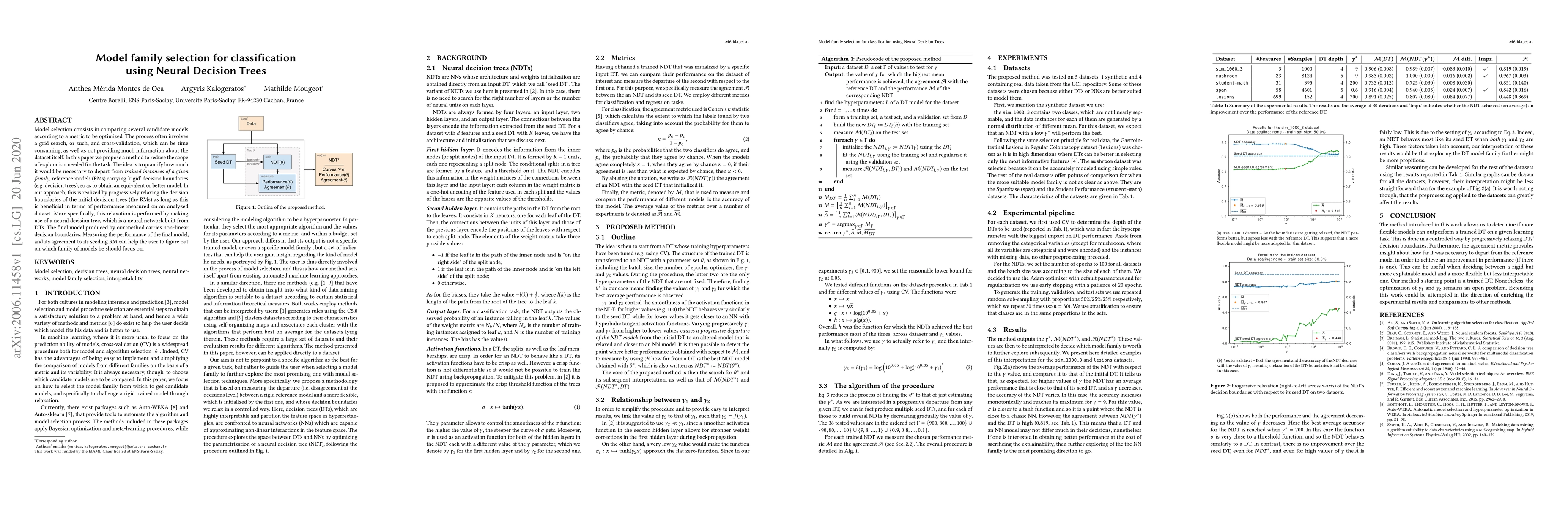 This paper proposes a method for efficient model selection using Neural Decision Trees, which relaxes the rigid decision boundaries of initial reference models to find optimal models. The approach measures performance and model agreement to guide users on which model family to focus on.