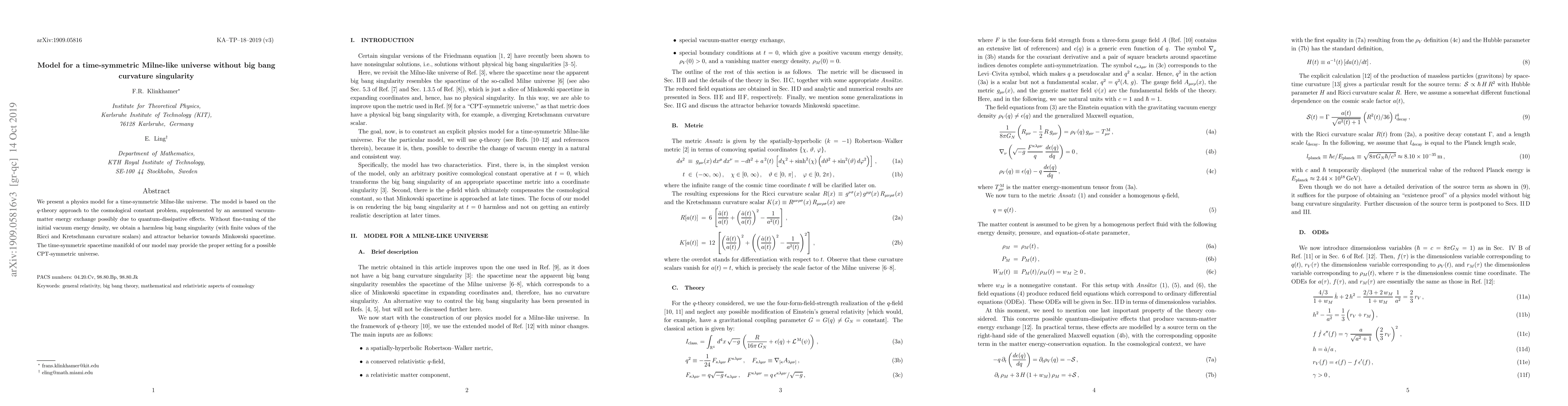 This paper proposes a time-symmetric Milne-like universe model that avoids a big bang curvature singularity, utilizing $q$-theory and quantum-dissipative effects to achieve a finite Ricci and Kretschmann curvature scalar, suggesting a CPT-symmetric universe setting.