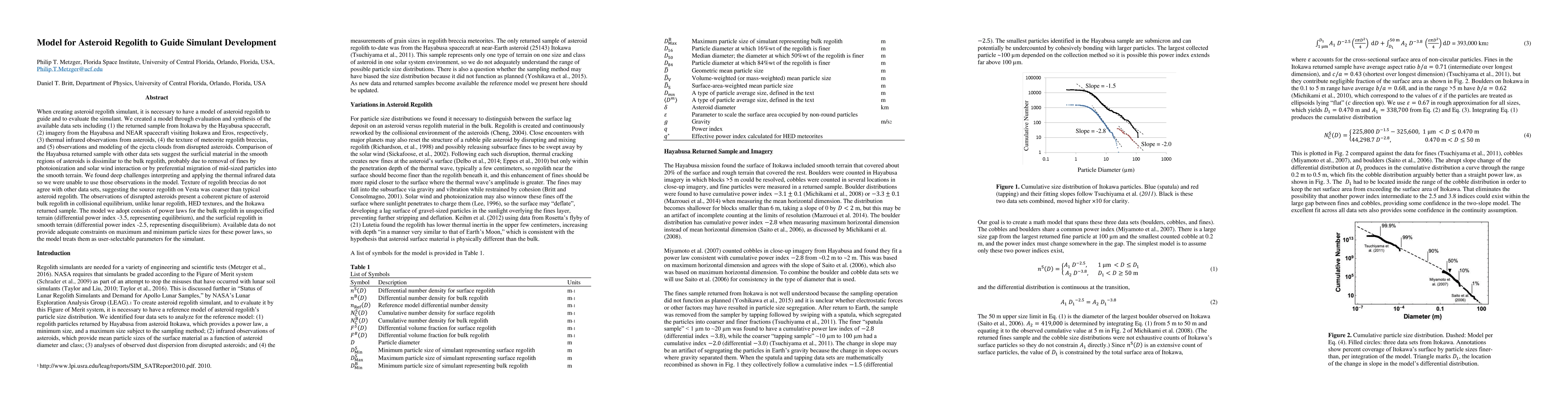 This paper develops a model for asteroid regolith to guide simulant development, synthesizing data from various sources including Itokawa samples, spacecraft imagery, meteorite regolith breccias, and disrupted asteroid observations. The model uses power laws for bulk and surficial regolith, with adjustable parameters due to insufficient data on particle size limits.