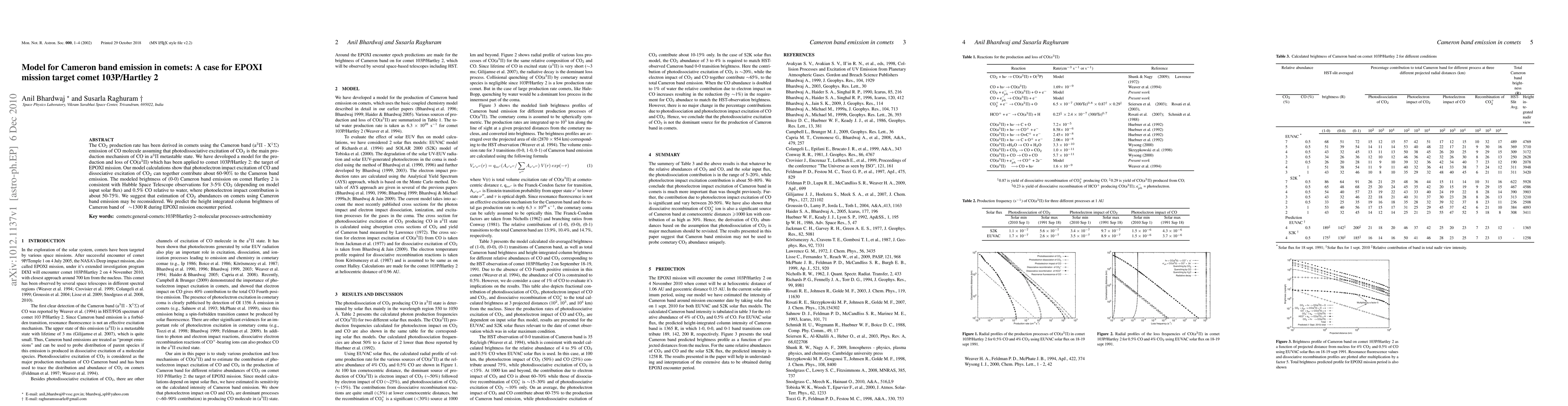 The paper develops a model for CO(a3Pi) production and loss in comets, applied to 103P/Hartley 2, showing that photoelectron impact and CO2 dissociative excitation contribute significantly to Cameron band emission. The model predicts a height integrated column brightness of ~1300 R during the EPOXI mission encounter, suggesting a reevaluation of CO2 abundance estimations using Cameron band emission.