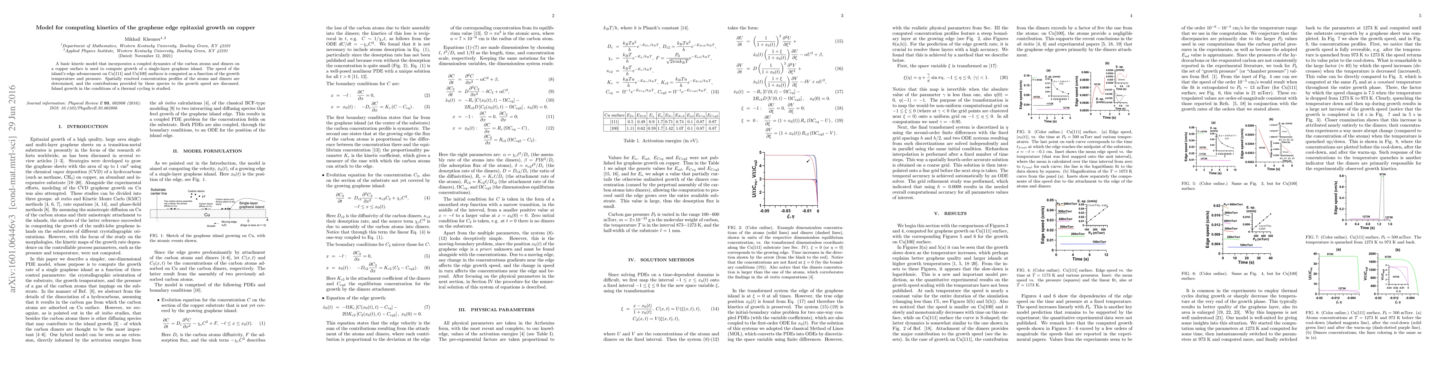 A basic kinetic model that incorporates a coupled dynamics of the carbon atoms and dimers on a copper surface is used to compute growth of a single-layer graphene island. The speed of the island's edge advancement on Cu[111] and Cu[100] surfaces is computed as a function of the growth temperature and pressure. Spatially resolved concentration profiles of the atoms and dimers are determined, and the contributions provided by these species to the growth speed are discussed. Island growth in the conditions of a thermal cycling is studied.