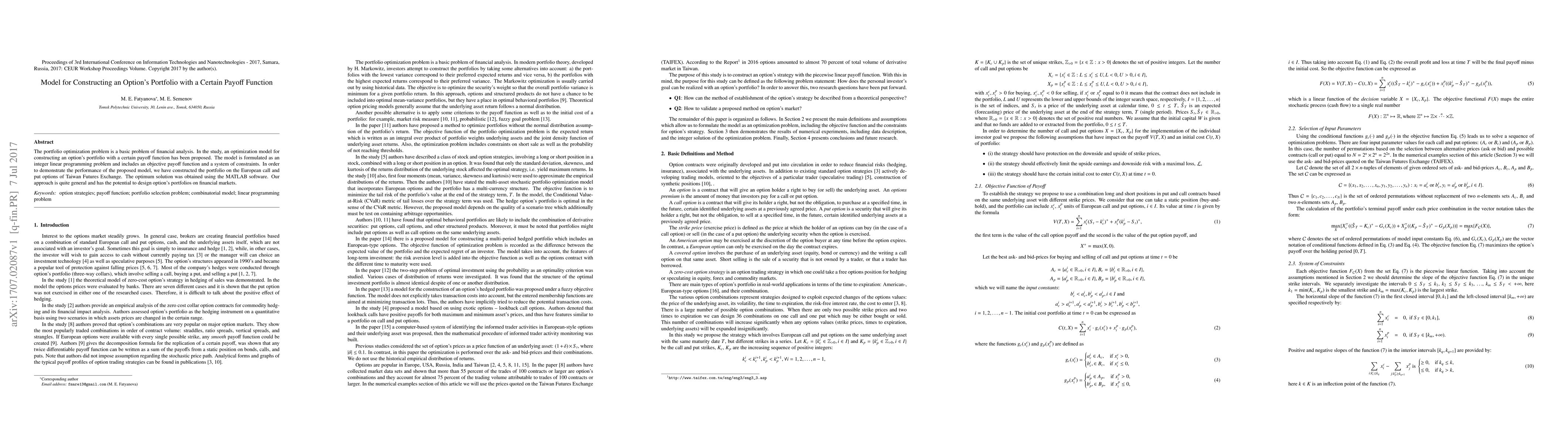 The portfolio optimization problem is a basic problem of financial analysis. In the study, an optimization model for constructing an options portfolio with a certain payoff function has been proposed. The model is formulated as an integer linear programming problem and includes an objective payoff function and a system of constraints. In order to demonstrate the performance of the proposed model, we have constructed the portfolio on the European call and put options of Taiwan Futures Exchange. The optimum solution was obtained using the MATLAB software. Our approach is quite general and has the potential to design options portfolios on financial markets.