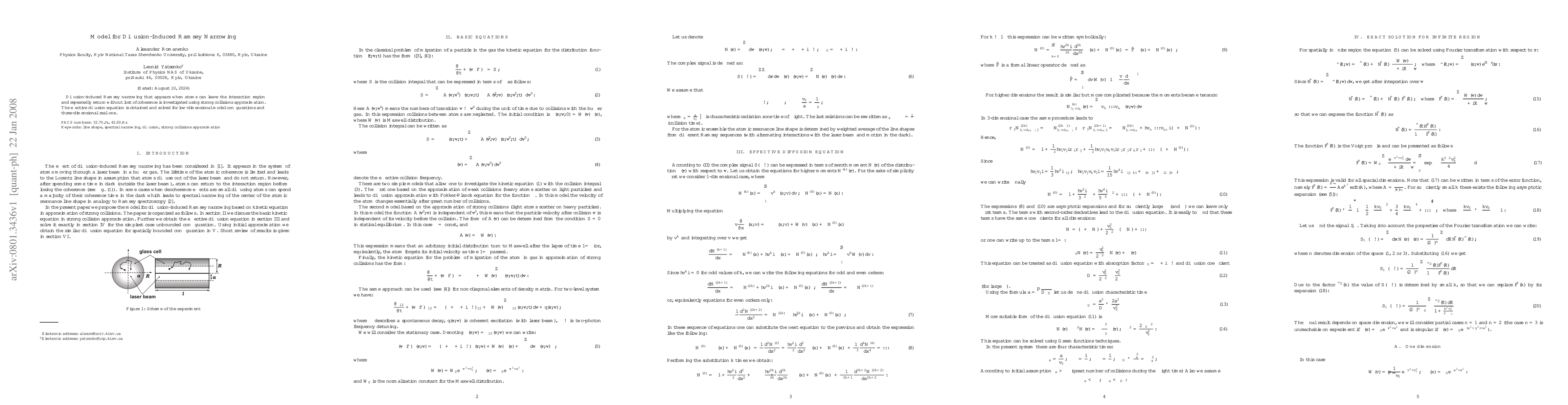 Diffusion-induced Ramsey narrowing that appears when atoms can leave the interaction region and repeatedly return without lost of coherence is investigated using strong collisions approximation. The effective diffusion equation is obtained and solved for low-dimensional model configurations and three-dimensional real one.
