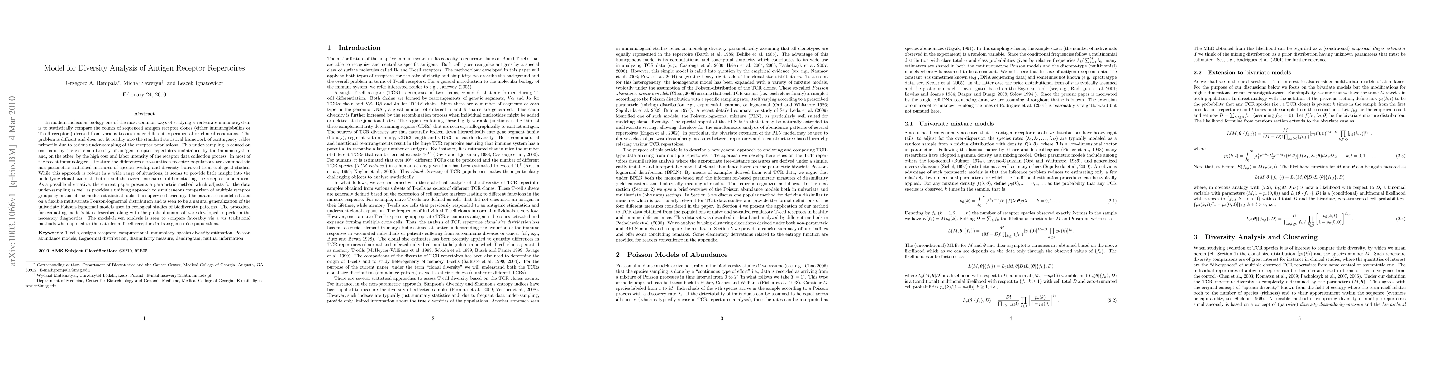 In most of the recent immunological literature the differences across antigen receptor populations are examined via non-parametric statistical measures of species overlap and diversity borrowed from ecological studies. While this approach is robust in a wide range of situations, it seems to provide little insight into the underlying clonal size distribution and the overall mechanism differentiating the receptor populations. As a possible alternative, the current paper presents a parametric method which adjusts for the data under-sampling as well as provides a unifying approach to simultaneous comparison of multiple receptor groups by means of the modern statistical tools of unsupervised learning. The parametric model is based on a flexible multivariate Poisson-lognormal distribution and is seen to be a natural generalization of the univariate Poisson-lognormal models used in ecological studies of biodiversity patterns. The procedure for evaluating model's fit is described along with the public domain software developed to perform the necessary diagnostics. The model-driven analysis is seen to compare favorably vis a vis traditional methods when applied to the data from T-cell receptors in transgenic mice populations.