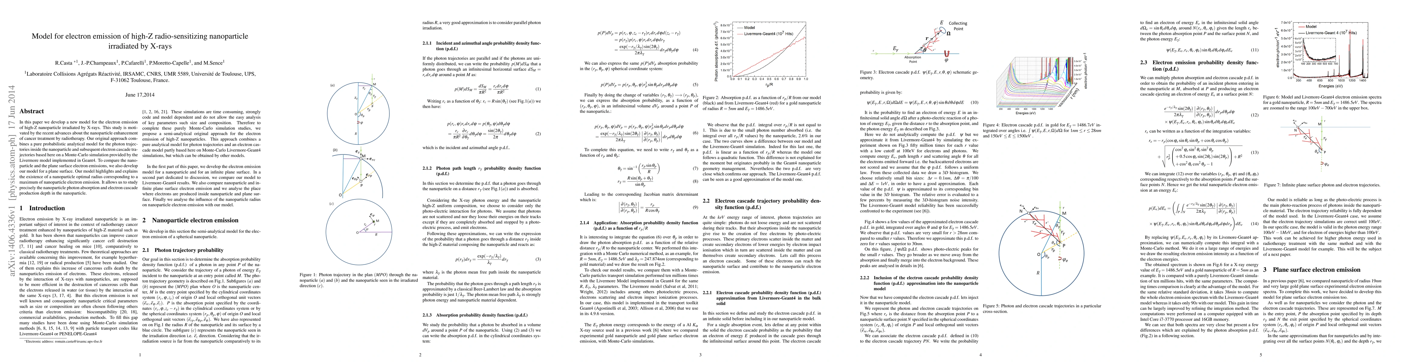 In this paper we develop a new model for the electron emission of high-Z nanoparticle irradiated by X-rays. This study is motivated by the recent advances about the nanoparticle enhancement of cancer treatment by radiotherapy. Our original approach combines a pure probabilistic analytical model for the photon trajectories inside the nanoparticle and subsequent electron cascade trajectories based here on a Monte-Carlo simulation provided by the Livermore model implemented in Geant4. To compare the nanoparticle and the plane surface electron emissions, we also develop our model for a plane surface. Our model highlights and explains the existence of a nanoparticle optimal radius corresponding to a maximum of nanoparticle electron emission. It allows us to study precisely the nanoparticle photon absorption and electron cascade production depth in the nanoparticle.