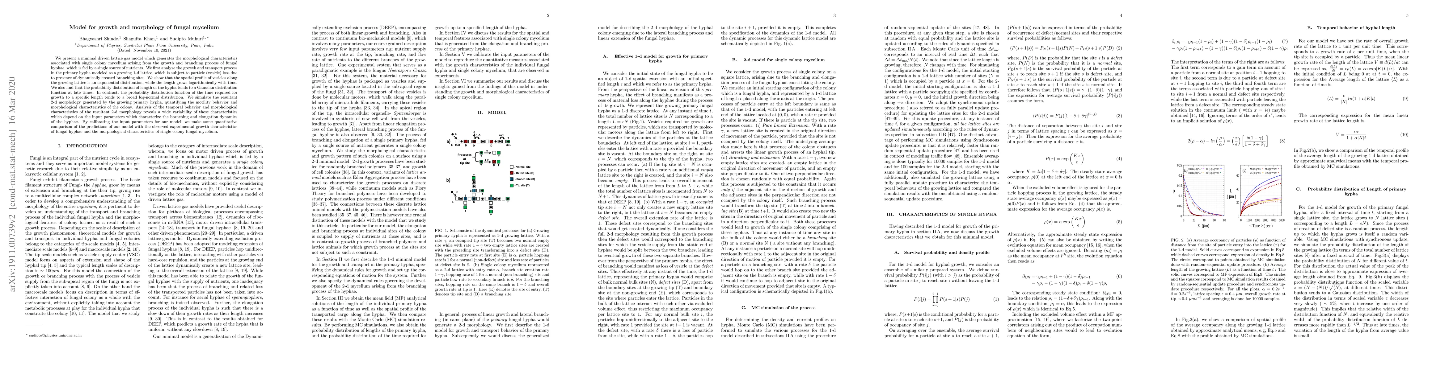 This research introduces a simplified model for fungal mycelium growth, showing 1-d hypha growth with exponential vesicle distribution and logarithmic length increase. The 2-d morphology simulation reveals varied characteristics dependent on branching and elongation dynamics, with quantitative comparisons to experimental observations of fungal hyphae growth and mycelium morphology.