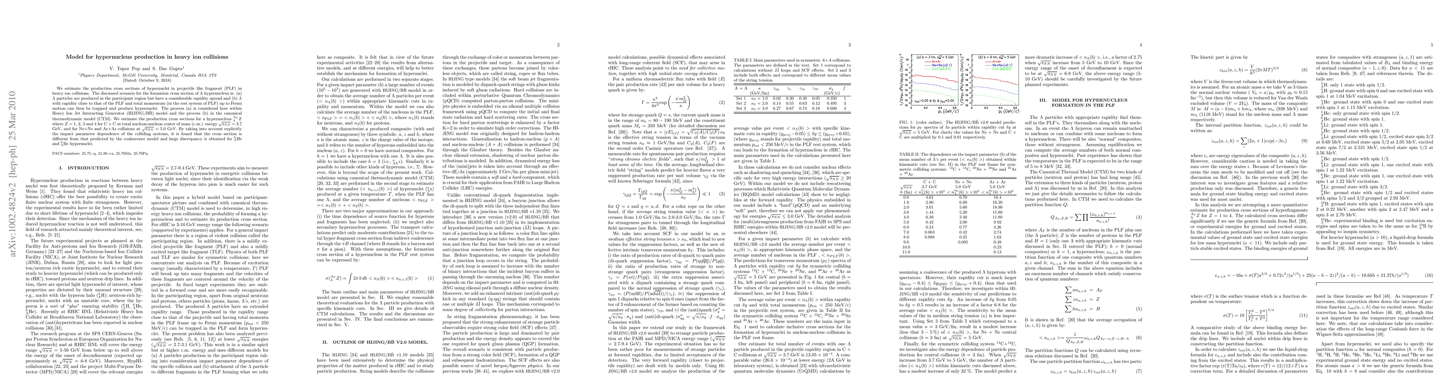 We estimate the production cross sections of hypernuclei in projectile like fragment (PLF) in heavy ion collisions. The discussed scenario for the formation cross section of hypernucleus is: (a) Lambda particles are produced in the participant region but have a considerable rapidity spread and (b) Lambda with rapidity close to that of the PLF and total momentum (in the rest system of PLF) up to Fermi motion can then be trapped and produce hypernuclei. The process (a) is considered here within Heavy Ion Jet Interacting Generator HIJING-BBbar model and the process (b) in the canonical thermodynamic model (CTM). We estimate the production cross-sections for light hypernuclei for C + C at 3.7 GeV total nucleon-nucleon center of mass energy and for Ne+Ne and Ar+Ar collisions at 5.0 GeV. By taking into account explicitly the impact parameter dependence of the colliding systems, it is found that the cross section is different from that predicted by the coalescence model and large discrepancy is obtained for 6_He and 9_Be hypernuclei.