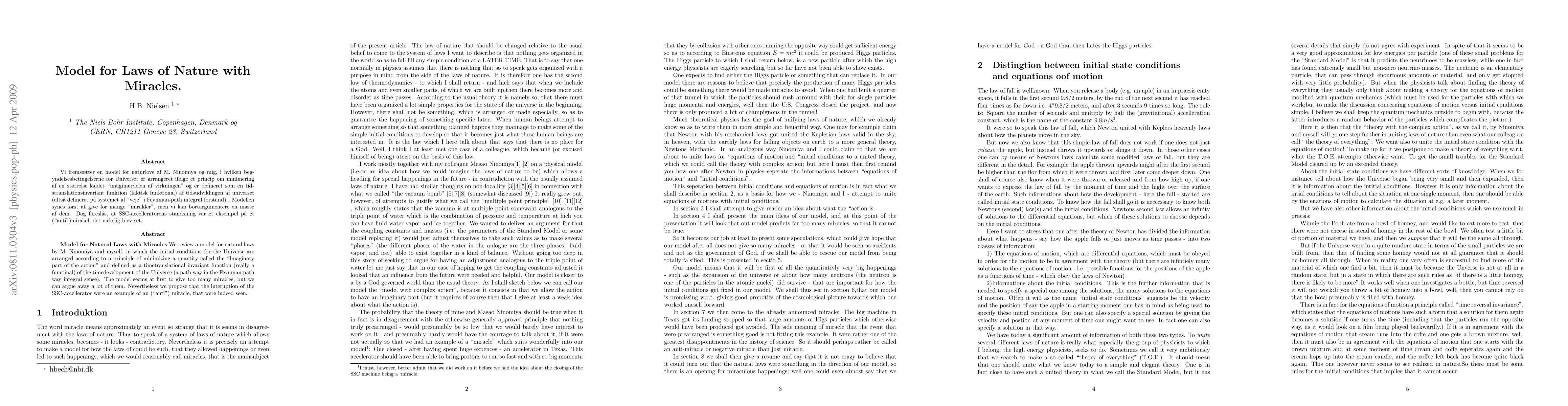 We review a work by M.Ninomiya and myself about a model for the initial state - i.e. which solution to the equations of motions - that is being realized. The to be realized solution is suggeted to be the one for which a certain number depending on the whole history of the development of the whole Unverse is minimal. This number is called "the imaginary part of the action" and since this article is meant to be somewhat popular the concept of an action is suggestively explained. At first the model of ours give too many miracles, but we believe to have argued that the number of miracles is drastically reduced so the model is not immediately excluded from having a chance of being true. A suggested miracle that has occured is the stopping by the US Congress of the large accelerator SSC under construction already in Texas. A similar bad fait is predicted for the soon to start accelerator LHC in Geneva! By translation submission it has still not started up to its proper energy per particle.