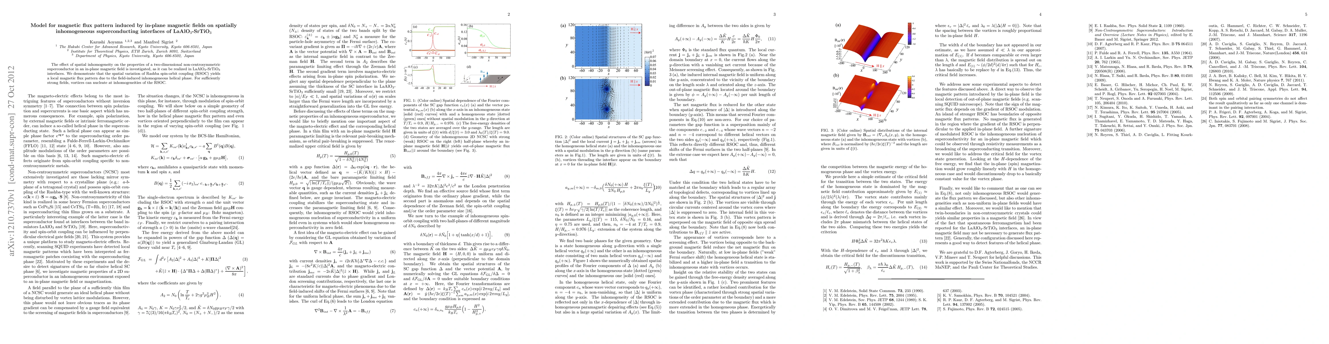 The effect of spatial inhomogeneity on the properties of a two-dimensional non-centrosymmetric superconductor in an in-plane magnetic field is investigated, as it can be realized in LaAlO_3-SrTiO_3 interfaces. We demonstrate that the spatial variation of Rashba spin-orbit coupling (RSOC) yields a local magnetic flux pattern due to the field-induced inhomogeneous helical phase. For sufficiently strong fields, vortices can nucleate at inhomogeneities of the RSOC.