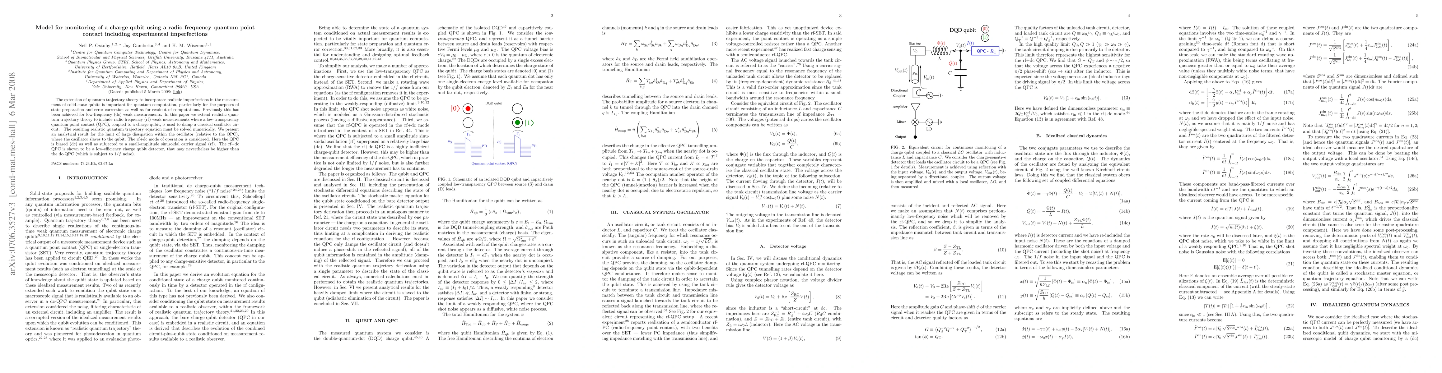 The extension of quantum trajectory theory to incorporate realistic imperfections in the measurement of solid-state qubits is important for quantum computation, particularly for the purposes of state preparation and error-correction as well as for readout of computations. Previously this has been achieved for low-frequency (dc) weak measurements. In this paper we extend realistic quantum trajectory theory to include radio frequency (rf) weak measurements where a low-transparency quantum point contact (QPC), coupled to a charge qubit, is used to damp a classical oscillator circuit. The resulting realistic quantum trajectory equation must be solved numerically. We present an analytical result for the limit of large dissipation within the oscillator (relative to the QPC), where the oscillator slaves to the qubit. The rf+dc mode of operation is considered. Here the QPC is biased (dc) as well as subjected to a small-amplitude sinusoidal carrier signal (rf). The rf+dc QPC is shown to be a low-efficiency charge-qubit detector, that may nevertheless be higher than the dc-QPC (which is subject to 1/f noise).