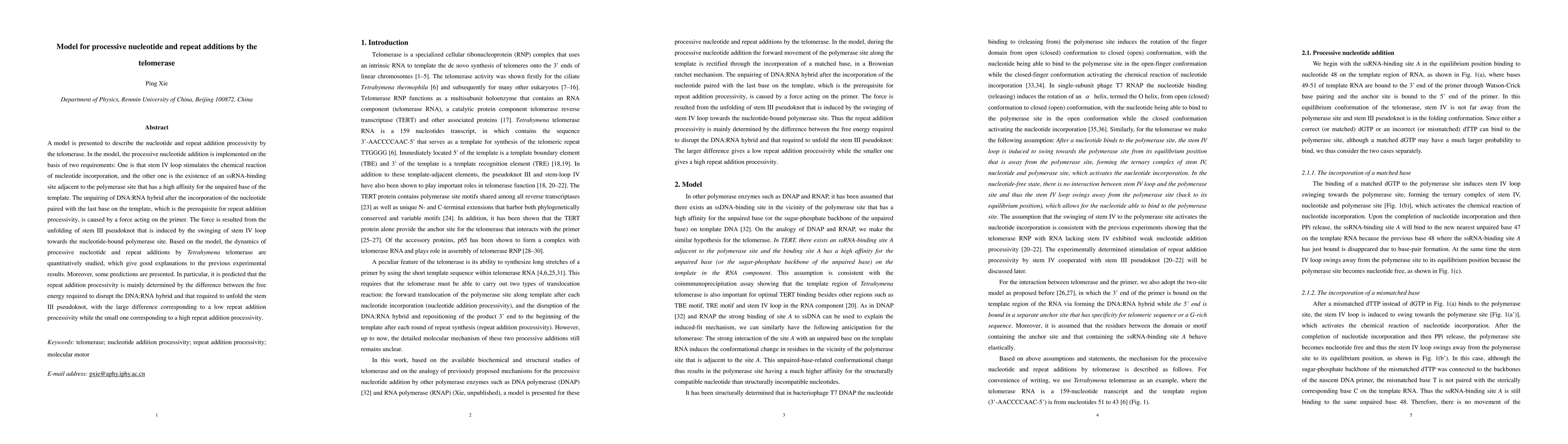 A model is presented to describe the nucleotide and repeat addition processivity by the telomerase. In the model, the processive nucleotide addition is implemented on the basis of two requirements: One is that stem IV loop stimulates the chemical reaction of nucleotide incorporation, and the other one is the existence of an ssRNA-binding site adjacent to the polymerase site that has a high affinity for the unpaired base of the template. The unpairing of DNA:RNA hybrid after the incorporation of the nucleotide paired with the last base on the template, which is the prerequisite for repeat addition processivity, is caused by a force acting on the primer. The force is resulted from the unfolding of stem III pseudoknot that is induced by the swinging of stem IV loop towards the nucleotide-bound polymerase site. Based on the model, the dynamics of processive nucleotide and repeat additions by Tetrahymena telomerase are quantitatively studied, which give good explanations to the previous experimental results. Moreover, some predictions are presented. In particular, it is predicted that the repeat addition processivity is mainly determined by the difference between the free energy required to disrupt the DNA:RNA hybrid and that required to unfold the stem III pseudoknot, with the large difference corresponding to a low repeat addition processivity while the small one corresponding to a high repeat addition processivity.