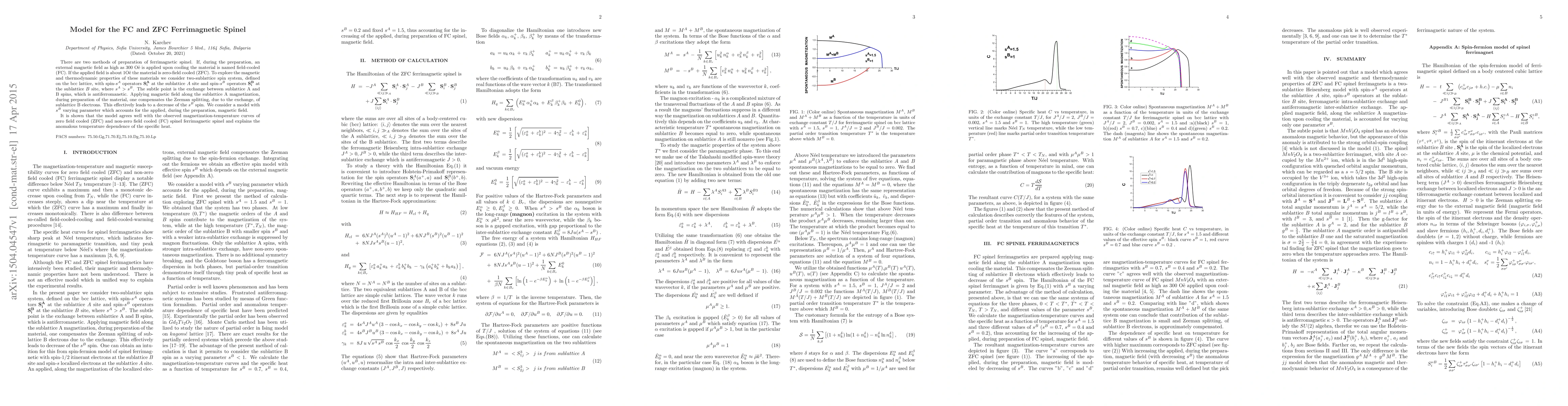 There are two methods of preparation of ferrimagnetic spinel. If, during the preparation, an external magnetic field as high as 300 O\"{e} is applied upon cooling the material is named field-cooled (FC). If the applied field is about 1O\"{e} the material is zero-field cooled (ZFC). To explore the magnetic and thermodynamic properties of these materials we consider two-sublattice spin system, defined on the bcc lattice, with spin-$s^A$ operators $\bf{S_{i}^A}$ at the sublattice $A$ site and spin-$s^B$ operators $\bf{S_{i}^B}$ at the sublattice $B$ site, where $s^A>s^B$. The subtle point is the exchange between sublattice A and B spins, which is antiferromanetic. Applying magnetic field along the sublattice A magnetization, during preparation of the material, one compensates the Zeeman splitting, due to the exchange, of sublattice B electrons. This effectively leads to a decrease of the $s^B$ spin. We consider a model with $s^B$ varying parameter which accounts for the applied, during the preparation, magnetic field. It is shown that the model agrees well with the observed magnetization-temperature curves of zero field cooled (ZFC) and non-zero field cooled (FC) spinel ferrimagnetic spinel and explains the anomalous temperature dependence of the specific heat.