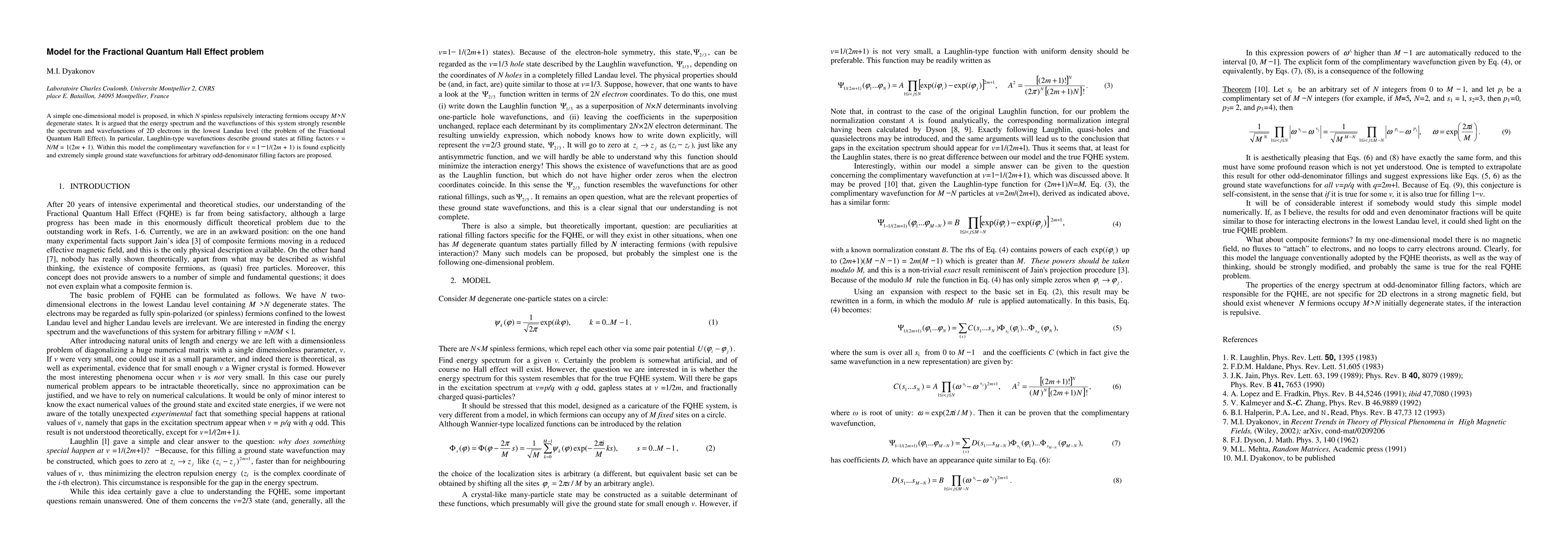 A simple one-dimensional model is proposed, in which N spinless repulsively interacting fermions occupy M>N degenerate states. It is argued that the energy spectrum and the wavefunctions of this system strongly resemble the spectrum and wavefunctions of 2D electrons in the lowest Landau level (the problem of the Fractional Quantum Hall Effect). In particular, Laughlin-type wavefunctions describe ground states at filling factors v = N/M = 1(2m+1). Within this model the complimentary wavefunction for v = 1-1/(2m + 1) is found explicitly and extremely simple ground state wavefunctions for arbitrary odd-denominator filling factors are proposed.