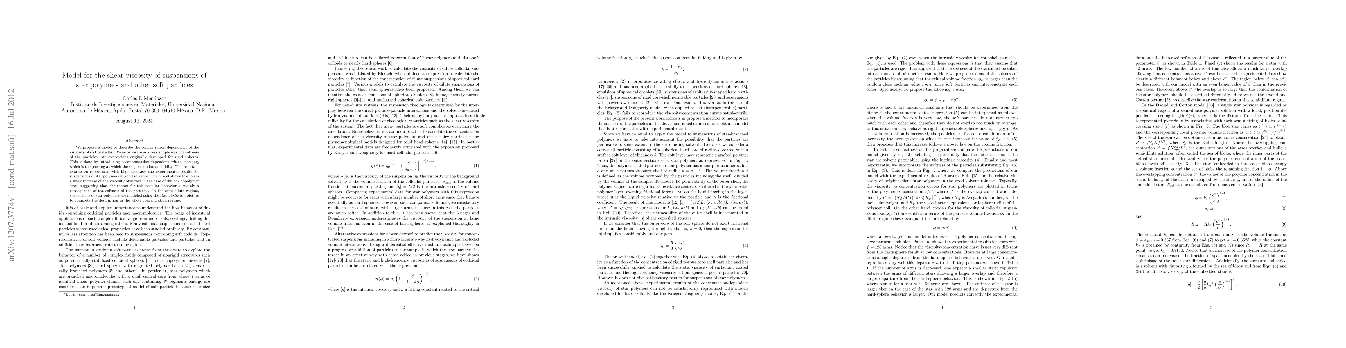 This paper proposes a model to describe the shear viscosity of suspensions of soft particles like star polymers, incorporating their softness into existing rigid sphere models. The model accurately reproduces experimental results and explains the viscosity behavior of diblock copolymer stars, attributing the observed weak increase to particle softness.