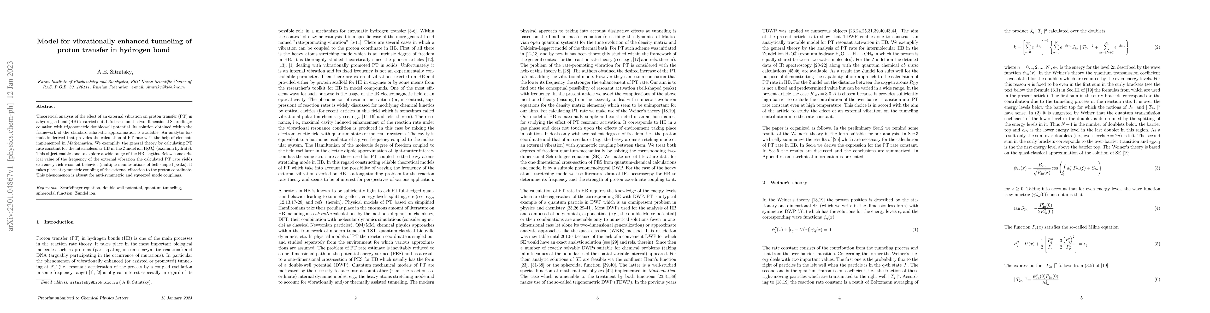 This paper presents a theoretical model for the vibrationally enhanced tunneling of proton transfer in hydrogen bonds, using a two-dimensional Schrödinger equation. It derives an analytic formula for calculating the proton transfer rate under the influence of external vibration, exemplified by the Zundel ion, showing rich resonant behavior at symmetric coupling.