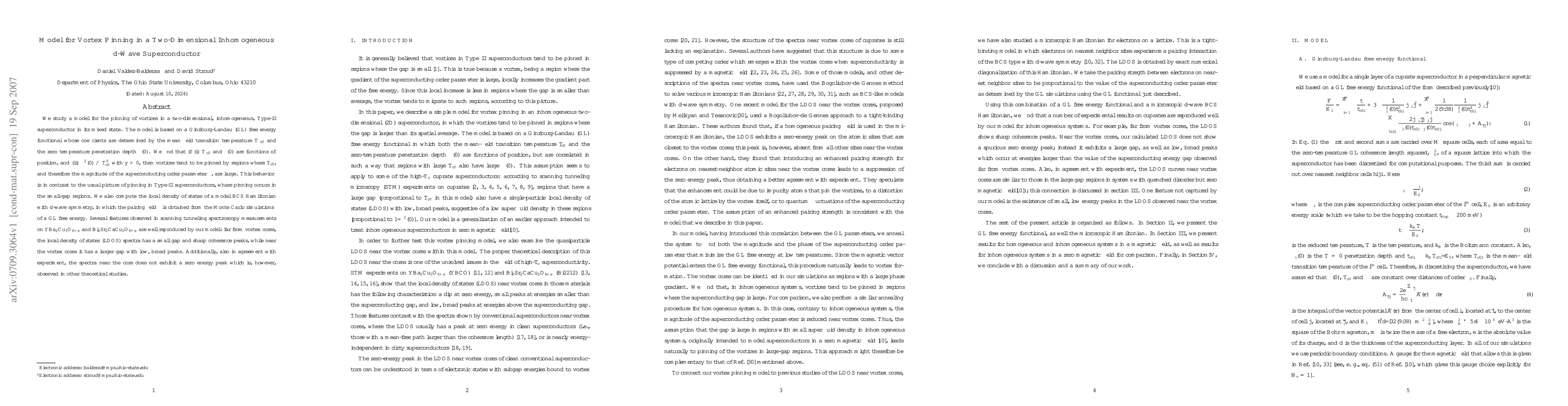 We study a model for the pinning of vortices in a two-dimensional, inhomogeneous, Type-II superconductor in its mixed state. The model is based on a Ginzburg-Landau (GL) free energy functional whose coefficients are determined by the mean-field transition temperature T_{c0} and the zero-temperature penetration depth \lambda(0). We find that if (i) T_{c0} and \lambda(0) are functions of position, and (ii) \lambda^2(0) is proportional to T_{c0}^y, with y greater than 0, then the vortices tend to be pinned where T_{c0}, and hence the magnitude of the superconducting order parameter \Delta, are large. This behavior is in contrast to the usual picture of pinning in Type-II superconductors, where pinning occurs in the small-gap regions. We also compute the local density of states of a model BCS Hamiltonian with d-wave symmetry, in which the pairing field is obtained from Monte Carlo simulations of a GL free energy. Several features observed in scanning tunneling spectroscopy measurements on YBa_2Cu_3O_{6+x} and Bi_2Sr_2CaCu_2O_{8+x} are well reproduced by our model: far from the cores, the local density of states spectrum has a small gap and sharp coherence peaks, while near the cores it has a larger gap with low, broad peaks. Additionally, also in agreement with experiment, the spectrum near the core does not exhibit a zero-energy peak which is, however, observed in other theoretical studies.