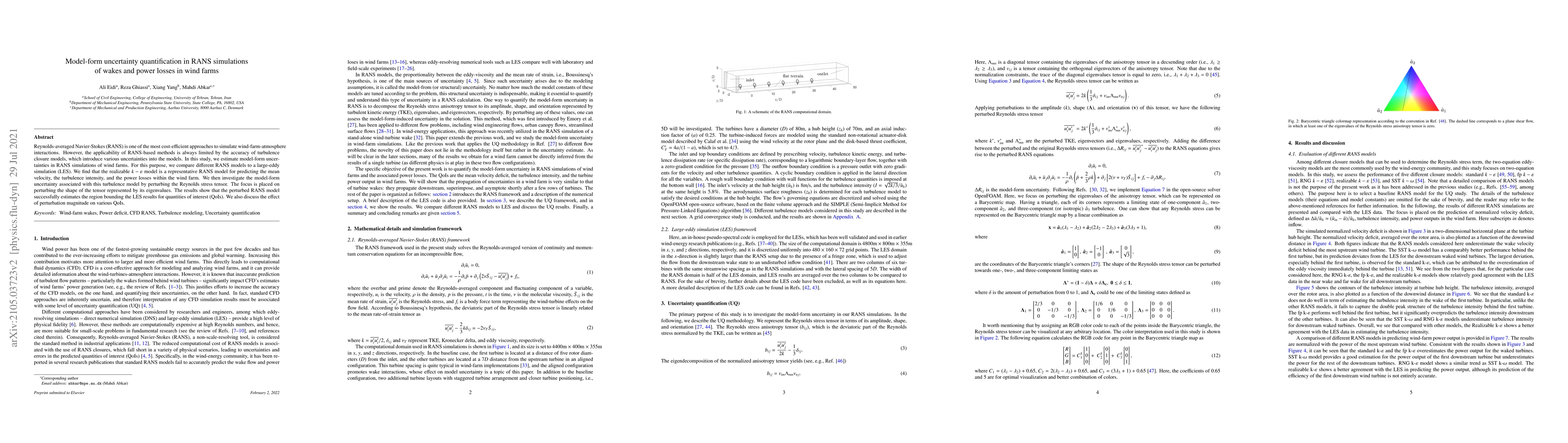 This study quantifies model-form uncertainties in RANS simulations of wind farms by comparing different RANS models to large-eddy simulations. The realizable k-epsilon model is found effective for predicting mean velocity, turbulence intensity, and power losses, and perturbing its Reynolds stress tensor successfully estimates the uncertainty bounds for key quantities.