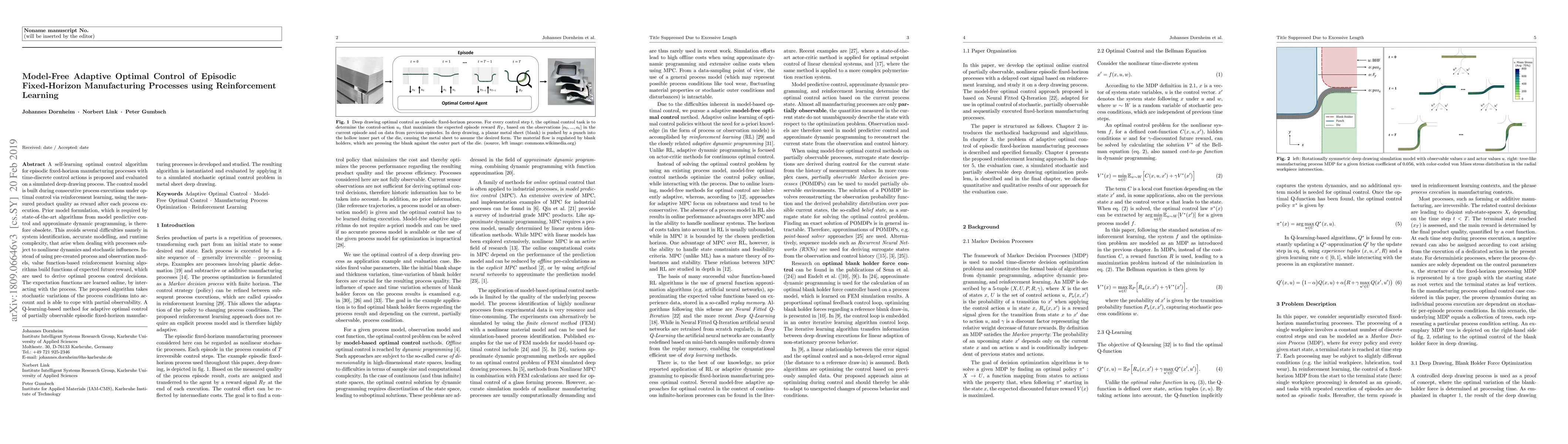 This paper proposes a model-free adaptive optimal control algorithm using reinforcement learning for episodic fixed-horizon manufacturing processes, eliminating the need for prior model formulation and addressing challenges in model identification and runtime complexity. The developed Q-learning-based method is evaluated on a simulated deep drawing process.
